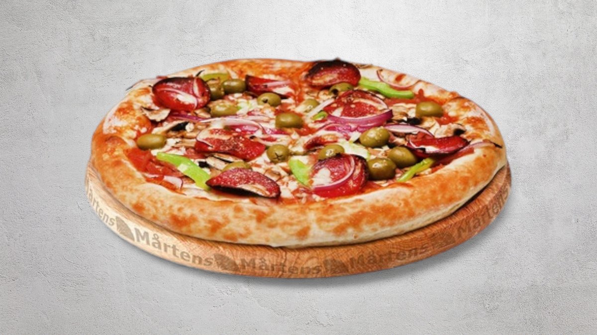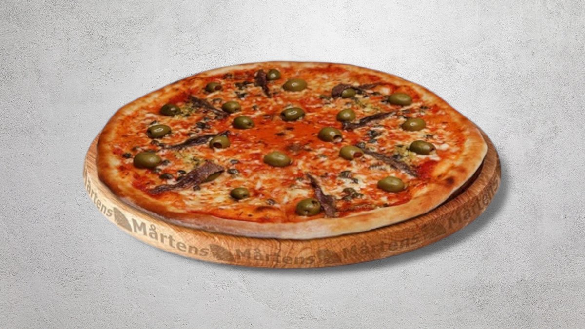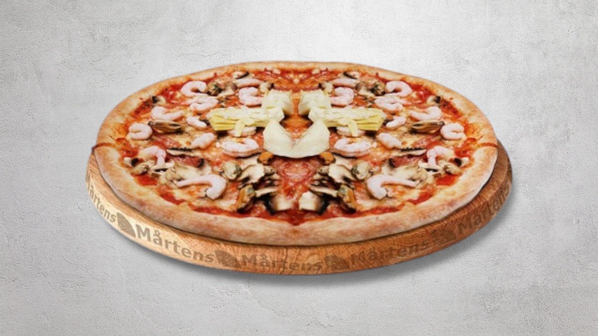 Tomatsås, ost, skinka, räkor, musslor, kronärtskocka och champinjoner.