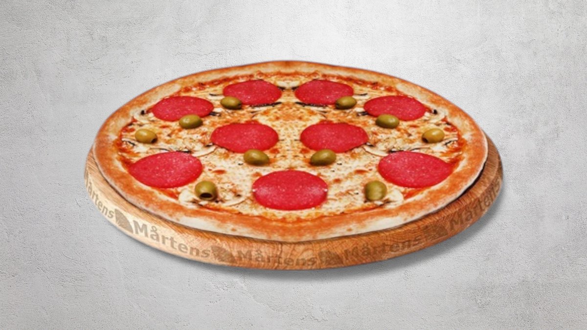 Tomatsås, ost, salami, svamp och oliver.