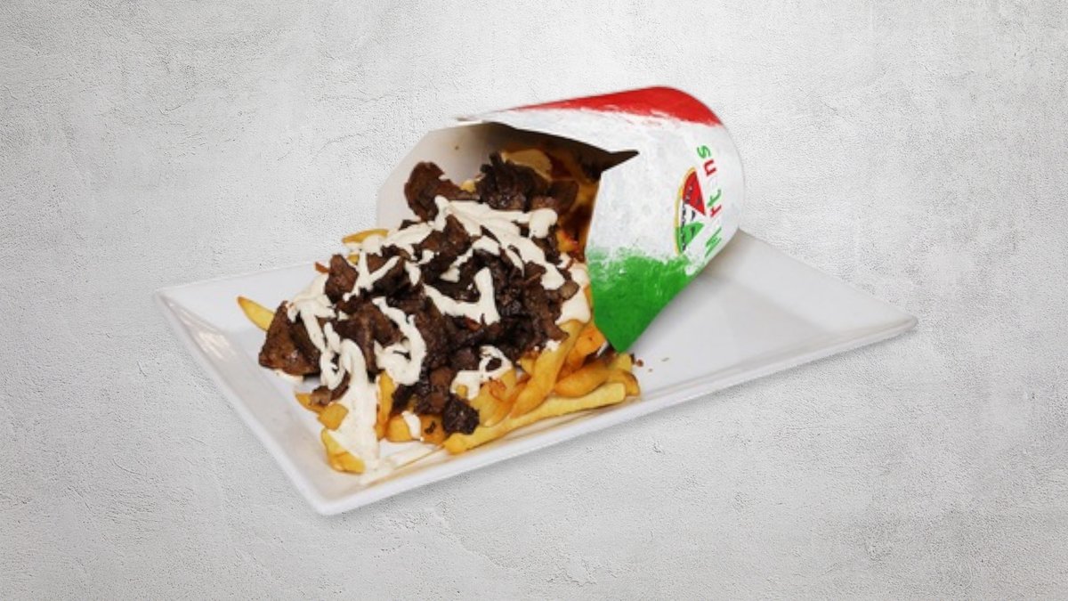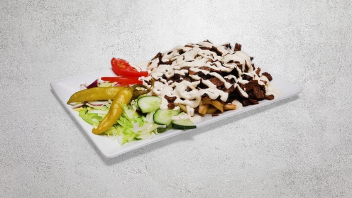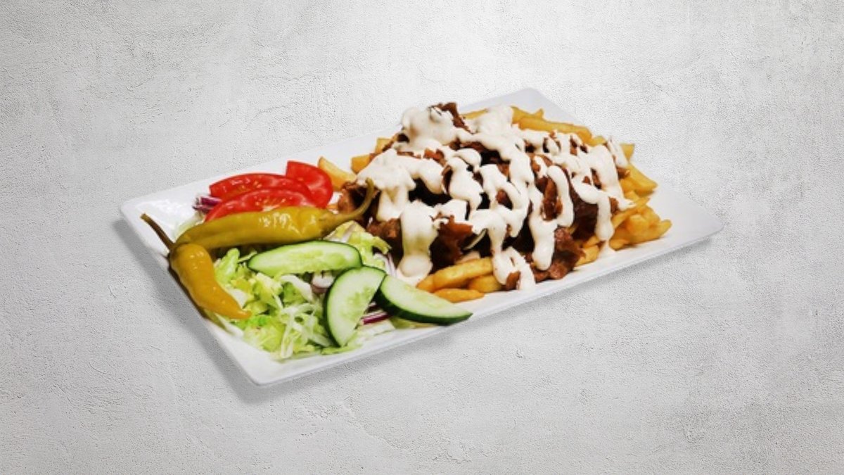 Tomatsås, ost, kebabkött (nötkött), pommes frites och mild sås.