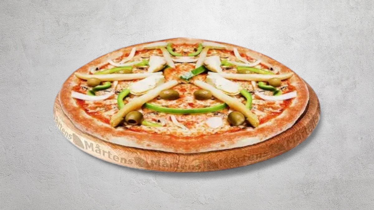 Tomatsås, ost, lök, paprika, sparris, kronärtskocka, champinjoner och oliver.