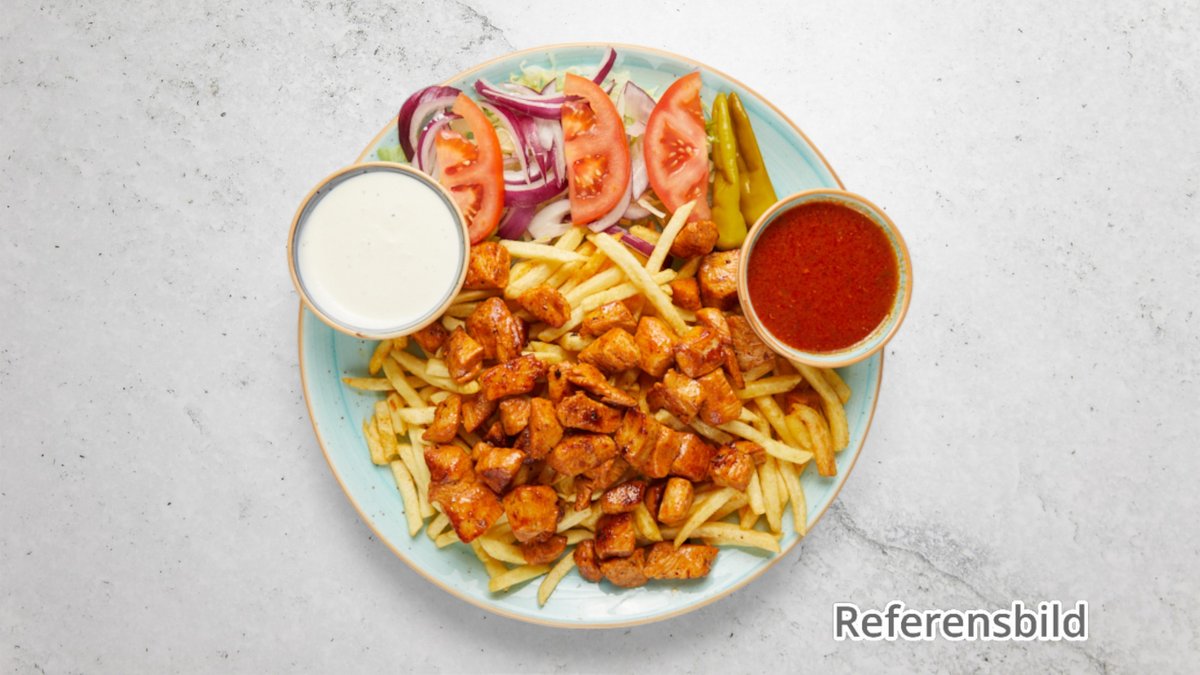Kebabkött, pommes, sallad, lök, feferoni och valfri sås.