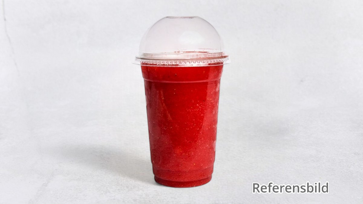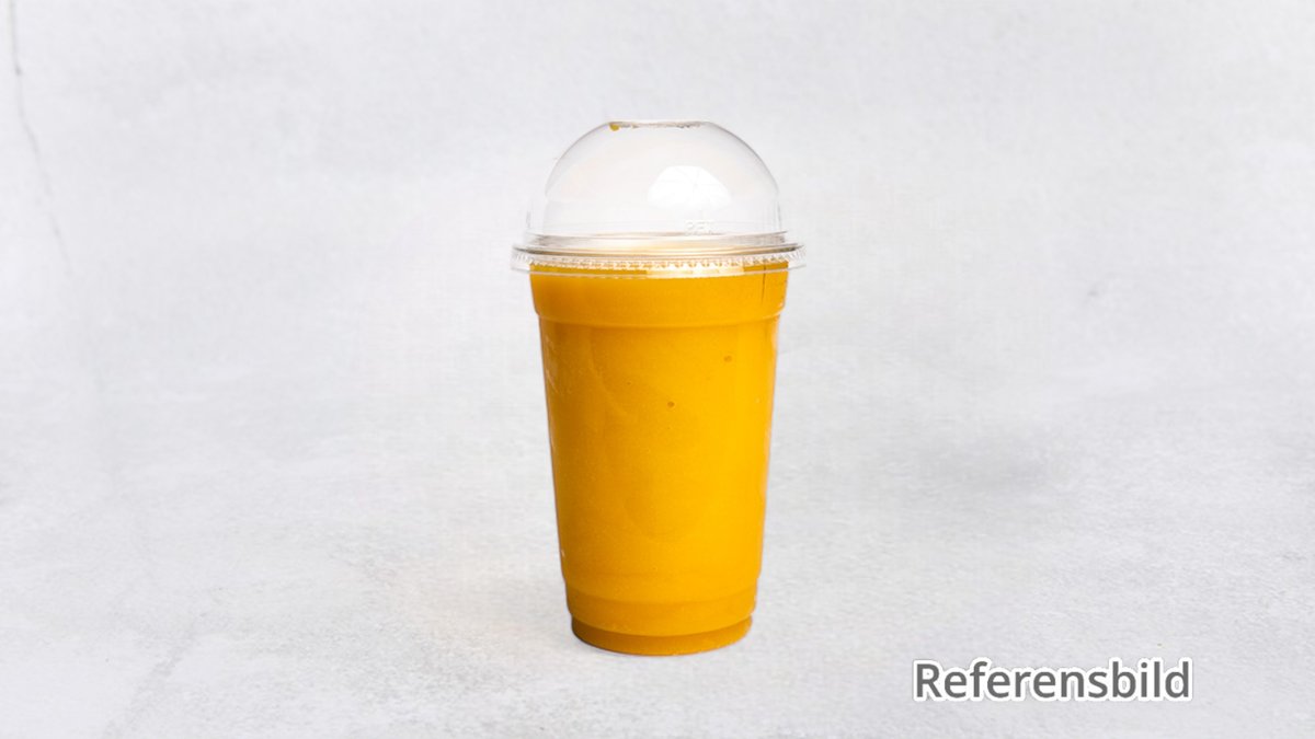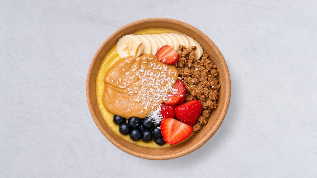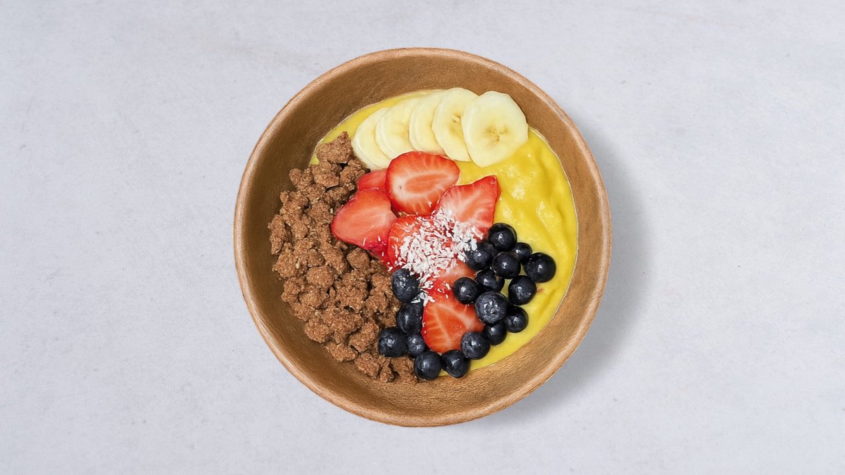Mango, havremjölk, banan, granola, jordgubbar, blåbär, kokos och jordnötssmör.
