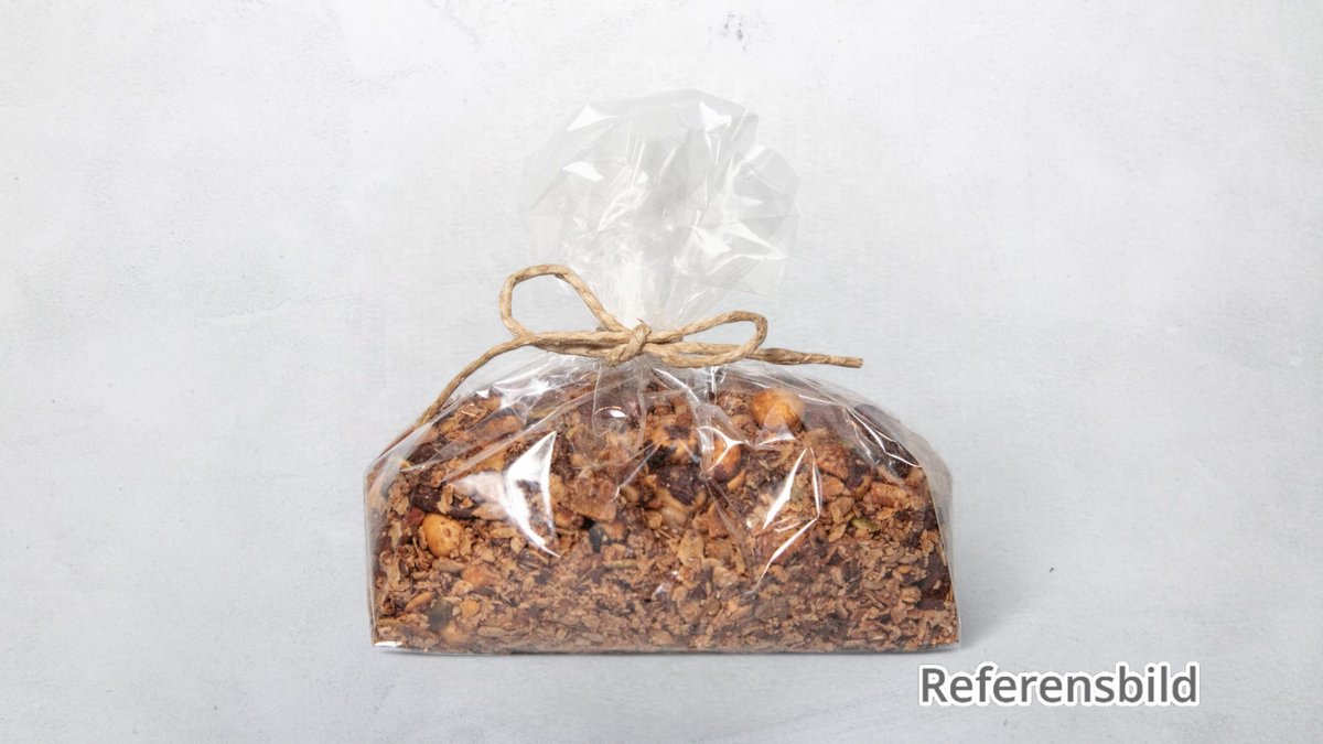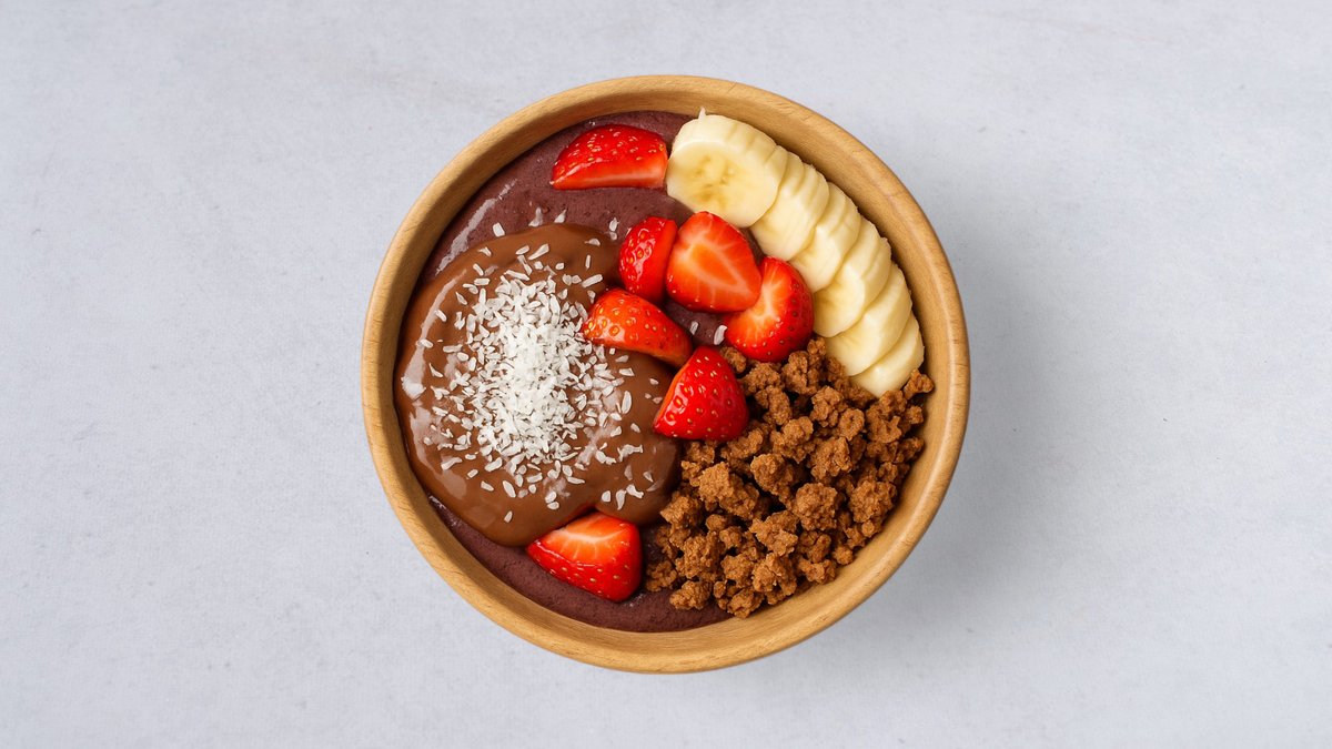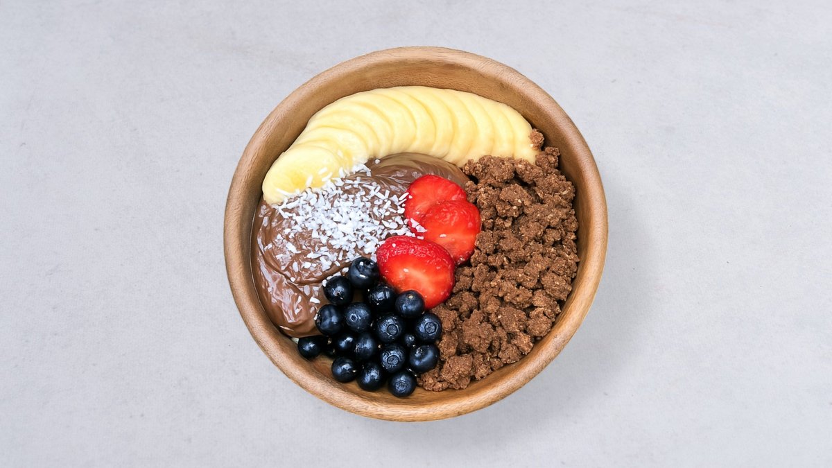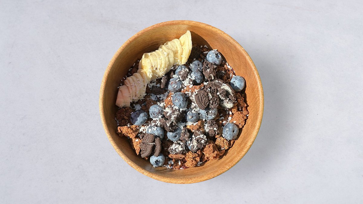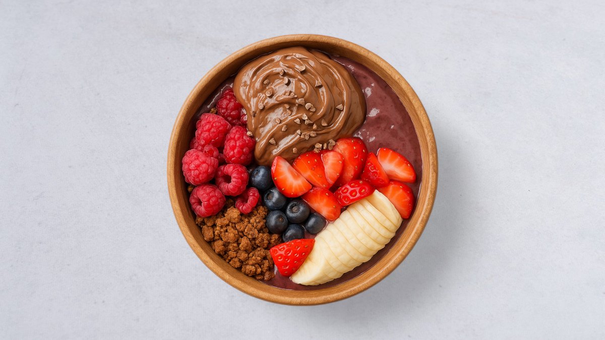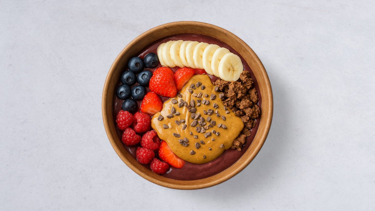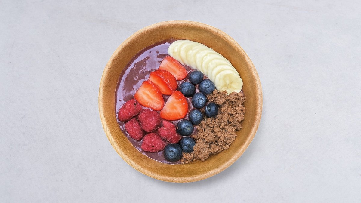Acai, granola, banan, hallon, jordgubb, blåbär, jordnötssmör och kakaonibs.