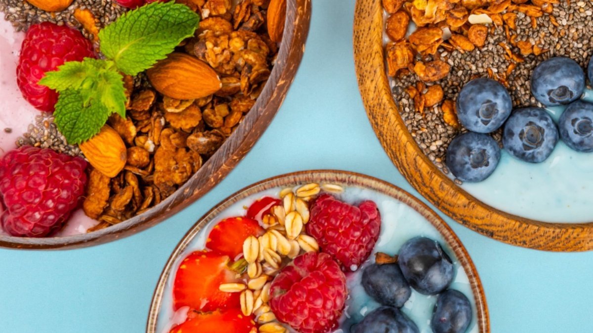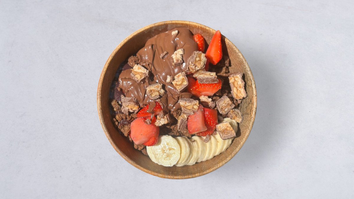 Acai, banan, granola, snickers, jordgubb och nutella.