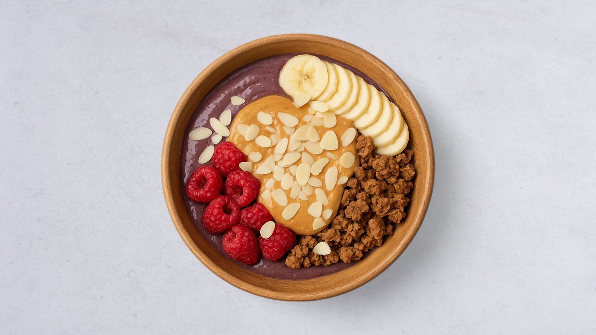 Acai, granola, banan, hallon, jordnötssmör, mandel och honung.
