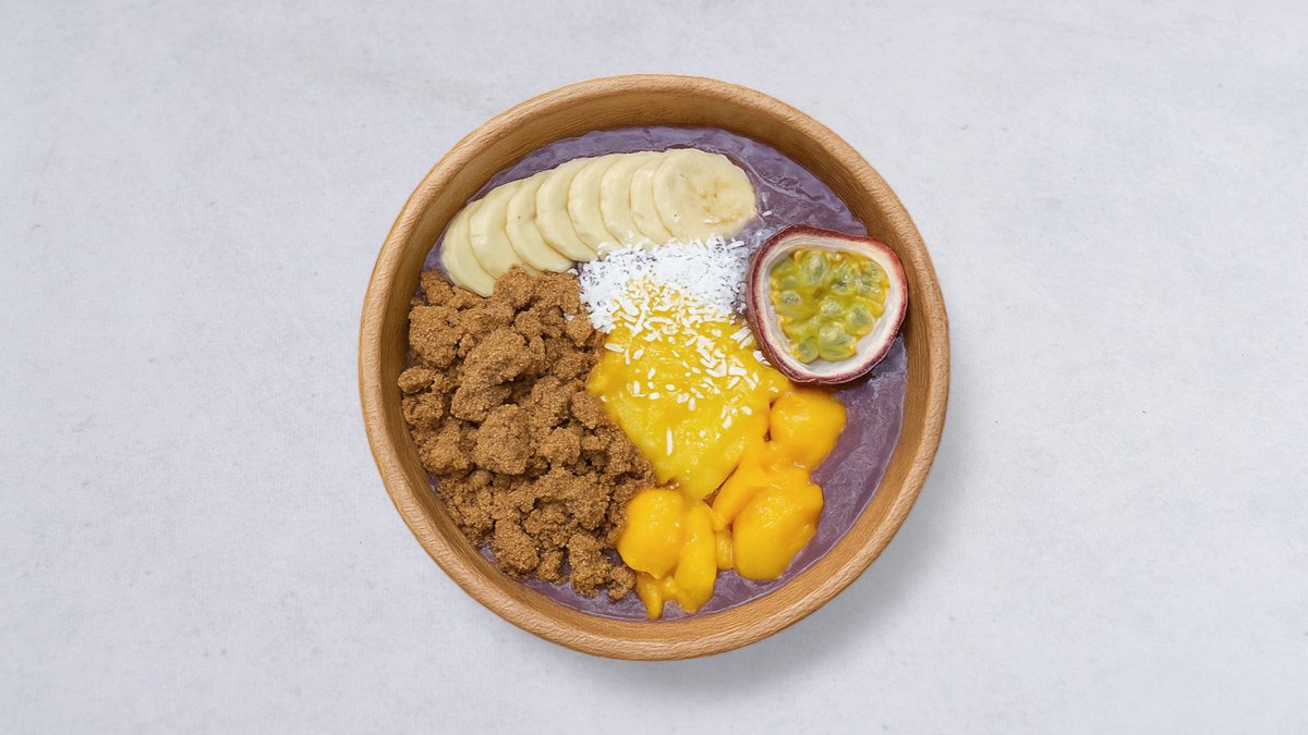 Acai, granola, banan, mango, passionsfrukt och kokos.