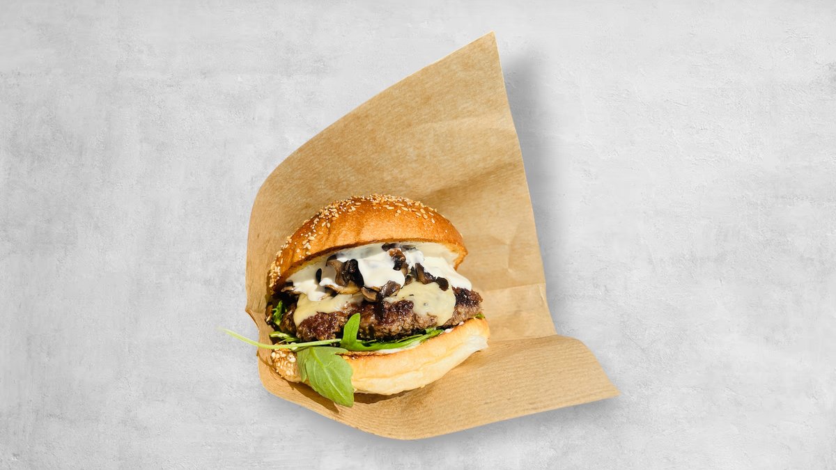 Sesambrioche, 2x160gr 100% beef, väddö tryffelost, majo, ruccola, stekta champinjoner och tryffelmajo