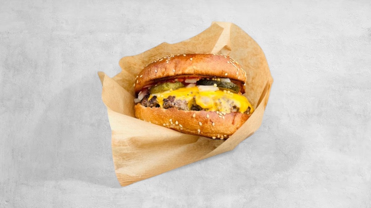 Sesambrioche, 160 g 100% beef, ketchup, finhackad lök, pickles, dubbel ost och yellow mustard.