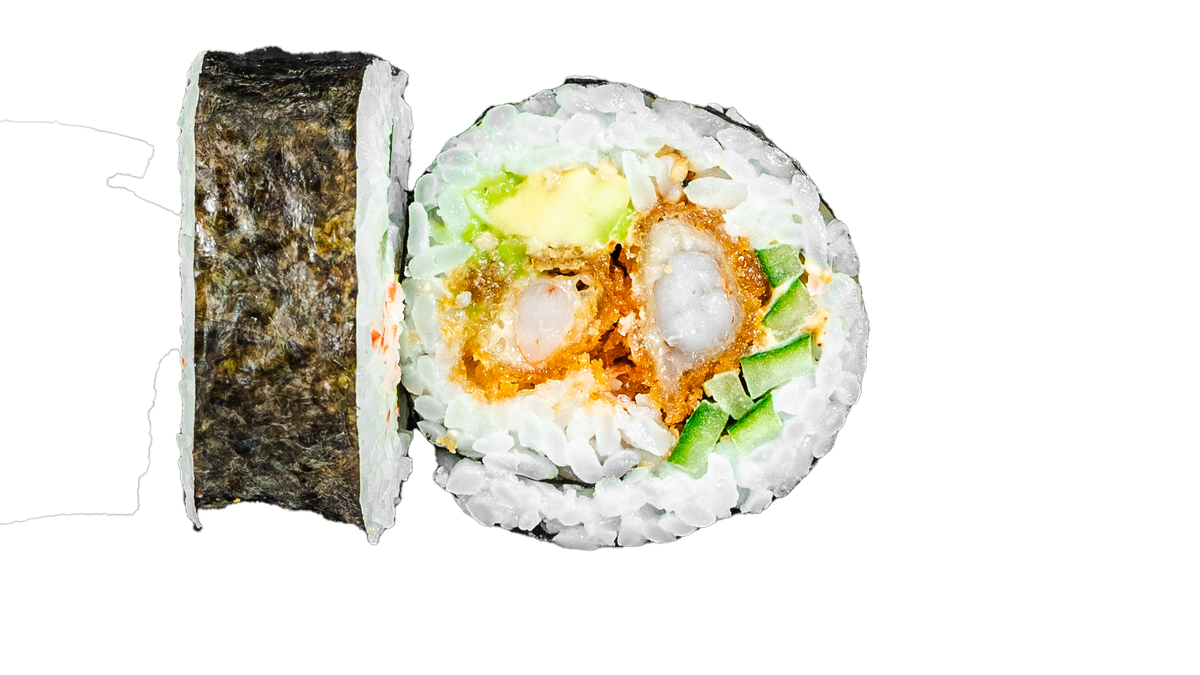 Friterade räkor, chilimajonnäs, avokado och gurka. Toppas med masago. Välj antal i nästa steg.