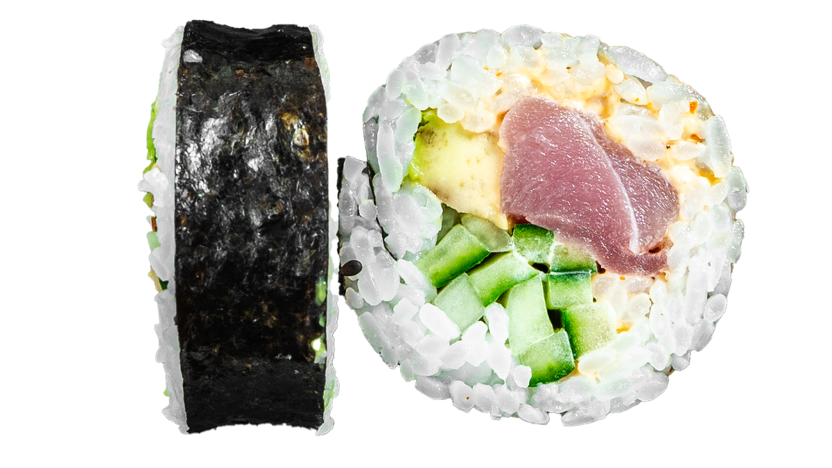 Tonfisk, chilimajonnäs, avokado och gurka. Toppas med salladslök. Välj antal i nästa steg.