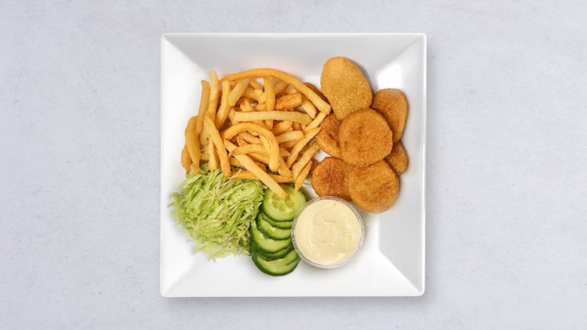 7 st chicken nuggets serveras med pommes, gurksallad och majonnäs dipp.