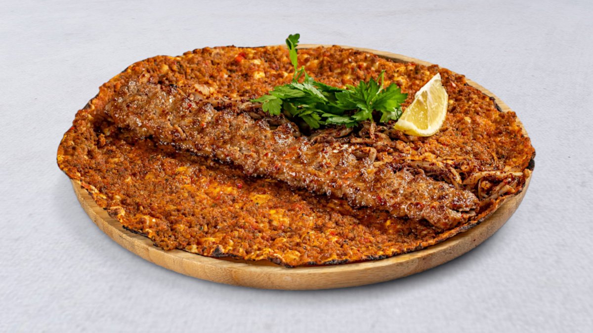 Turkisk pizza. Tunn bröddeg toppas med en blandning av kryddad köttfärs, tomat och färska örter. Serveras med sallad, citron och valfri sås.