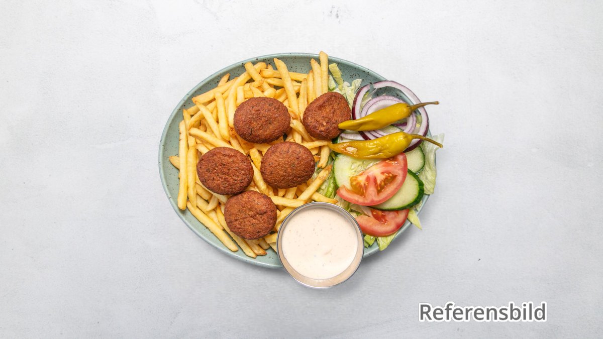Vegansk kebab med pommes, sallad, gurka, rödlök, tomat, fefferoni och valfri sås.