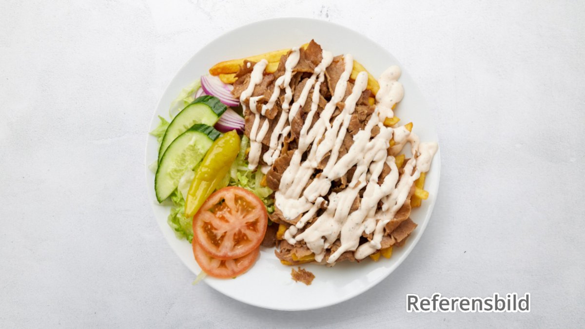 Serveras med sallad, gurka, tomat, lök, fefferoni och valfri sås.