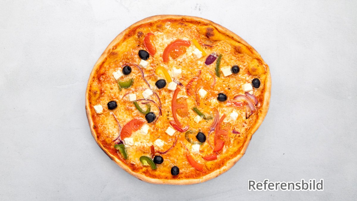 Pizza med paprika, tomat, oliver, champinjoner, fetaost och tzatziki.