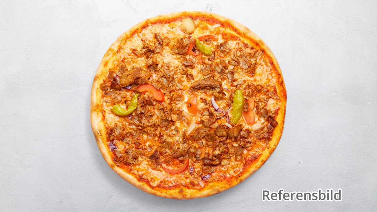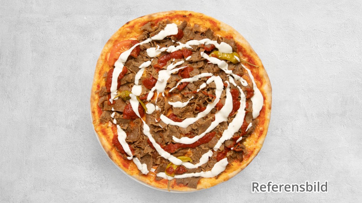 Pizza med vegansk kebab, fefferoni och valfri sås.