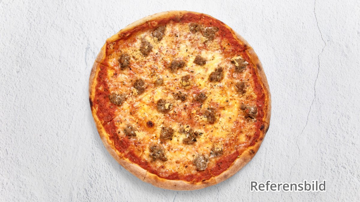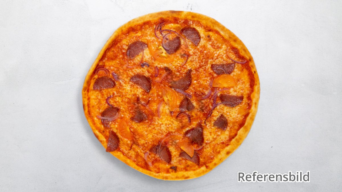 Pizza med vegetarisk färs, rödlök och vitlök.
