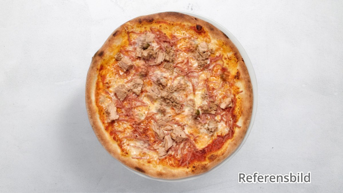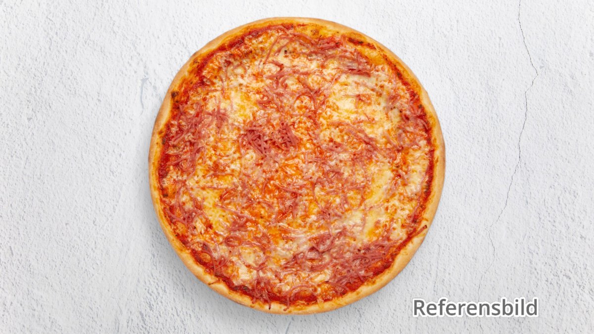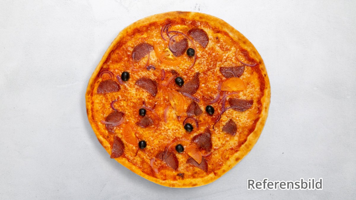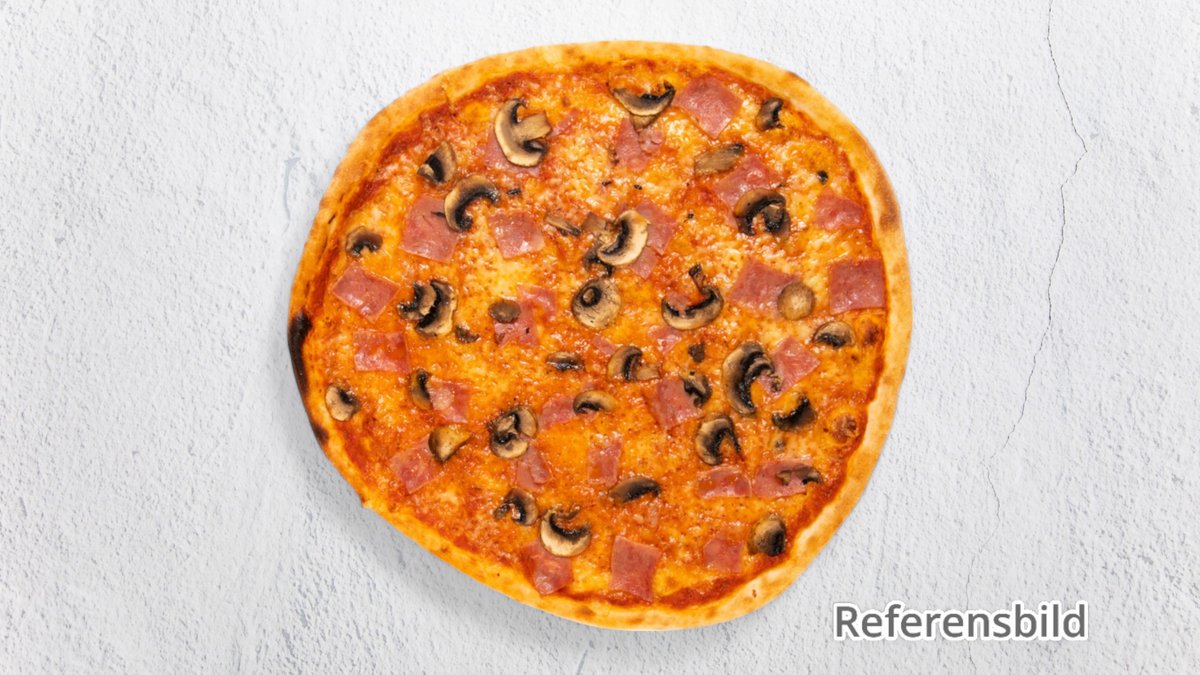 Pizza med oxskinka, räkor, oxbacon, lök, champinjoner, ägg och svartpeppar.