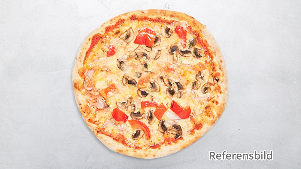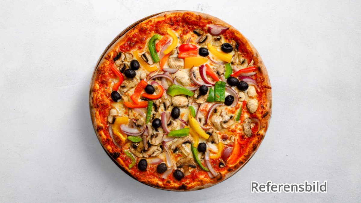 Pizza med lök, champinjoner, oliver, paprika, sparris och kronärtskockor.