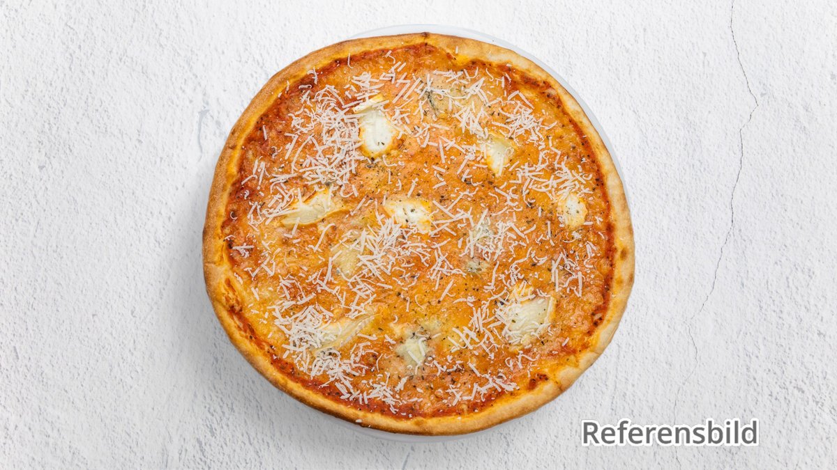 Pizza med oxskinka, räkor, musslor, champinjoner och kronärtskocka.