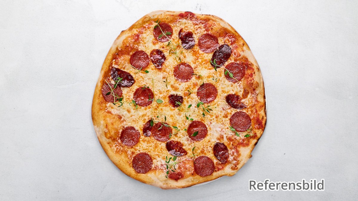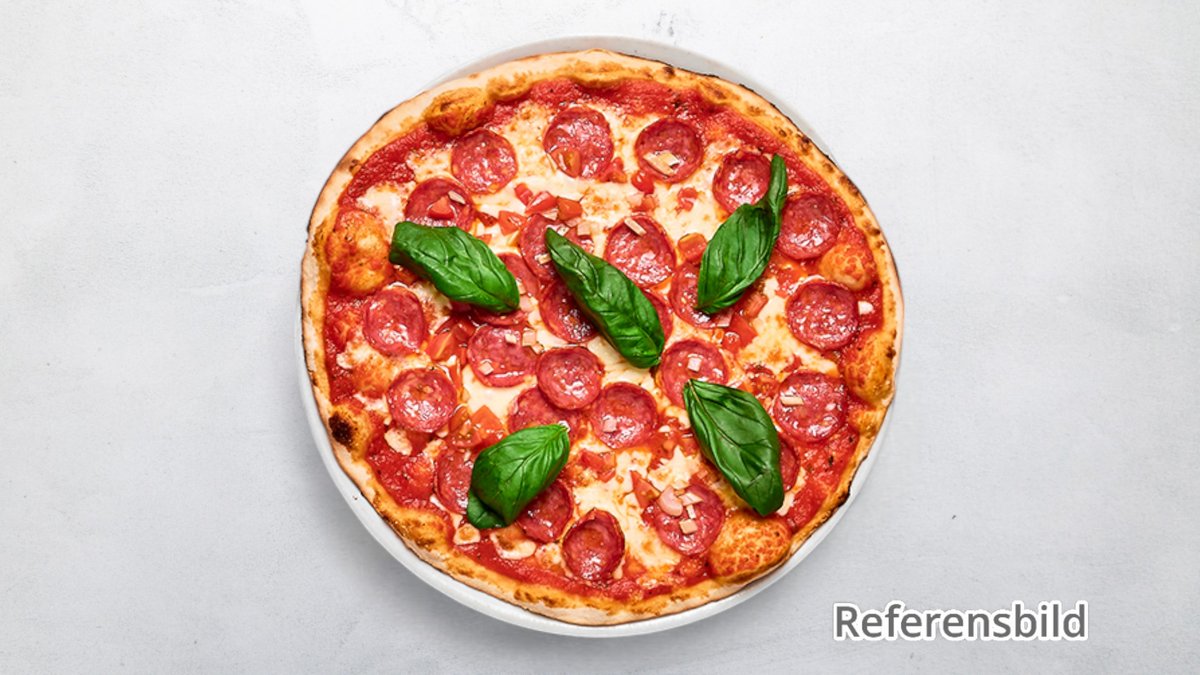 Pizza med kycklingkebab, fefferoni och valfri sås.