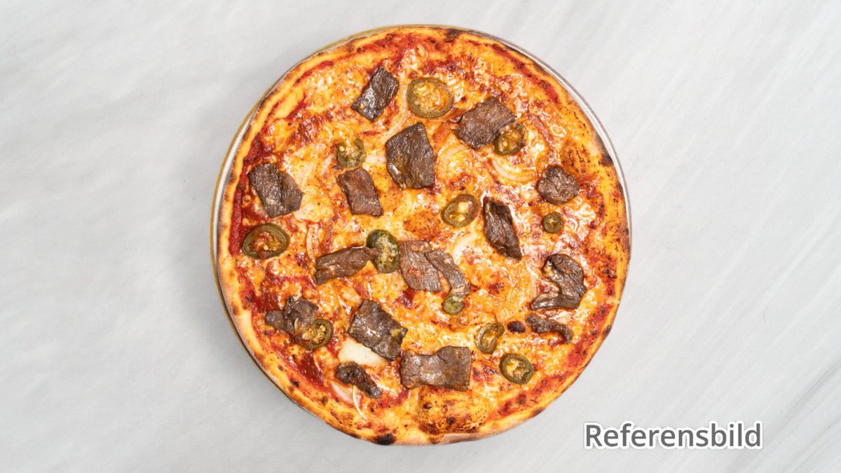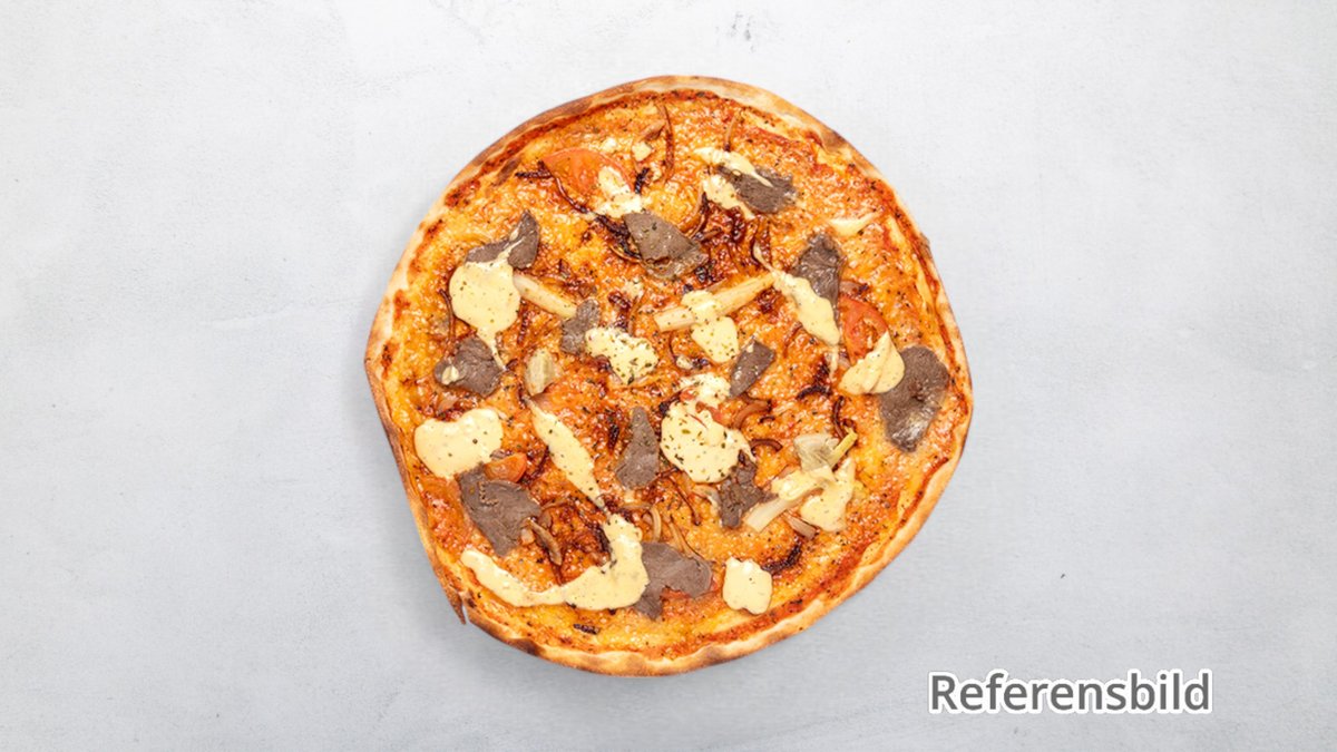 Pizza med rostade köttstrimlor, grönsaker och valfri sås.