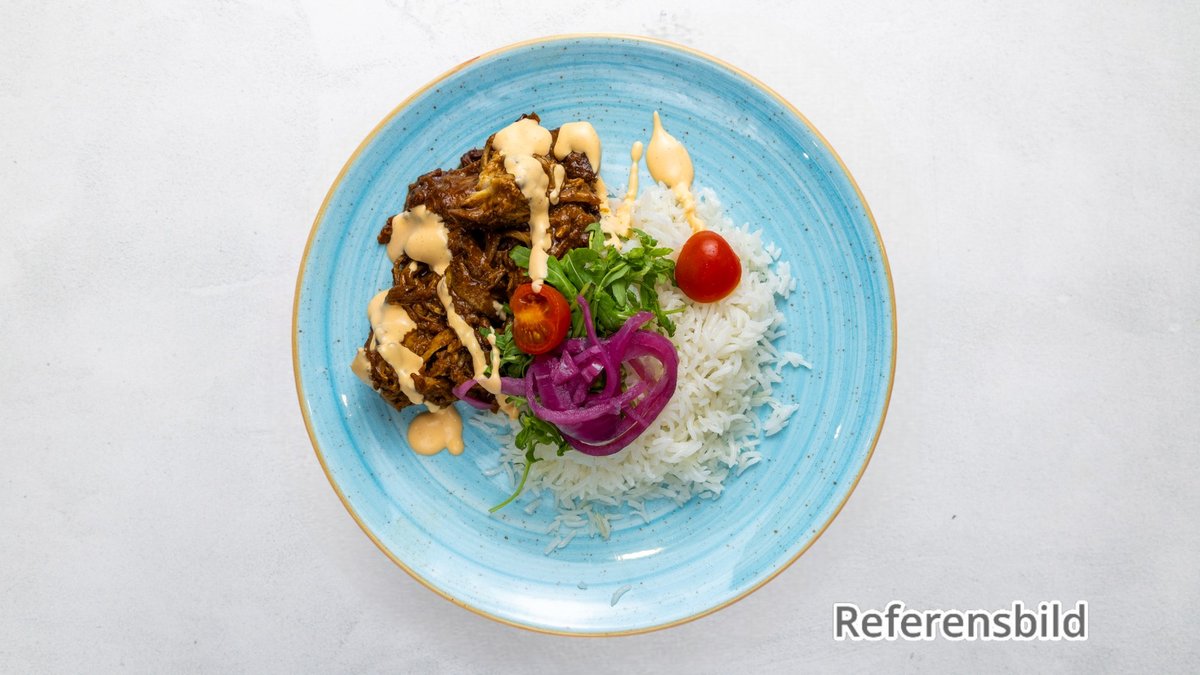 Serveras med ris och grönsaker.