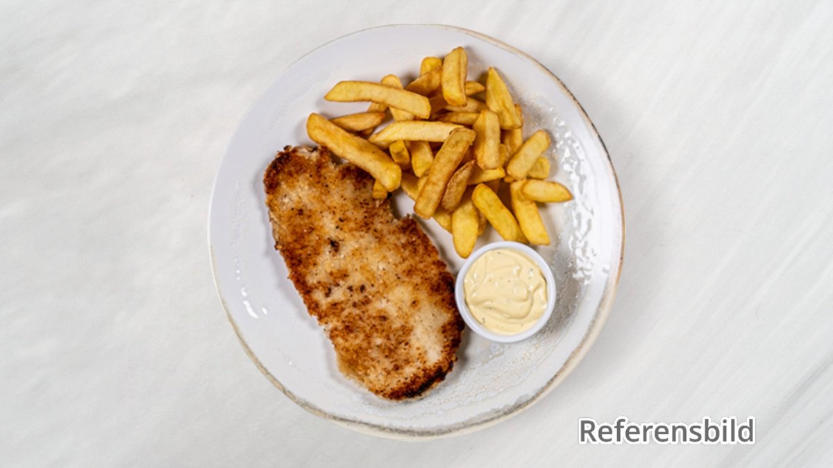 Friterad spätta med remouladsås och pommes frites.