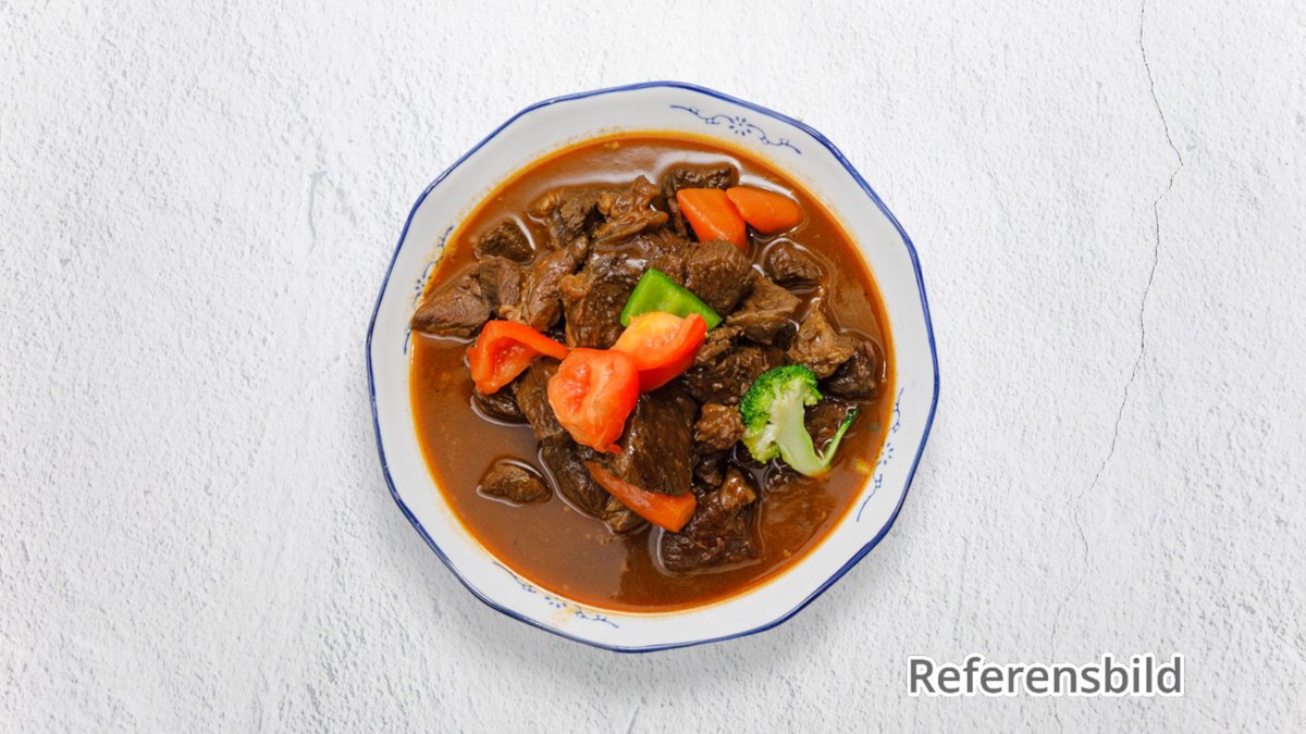 Högrev med lök, paprika, tomat serveras med ris.