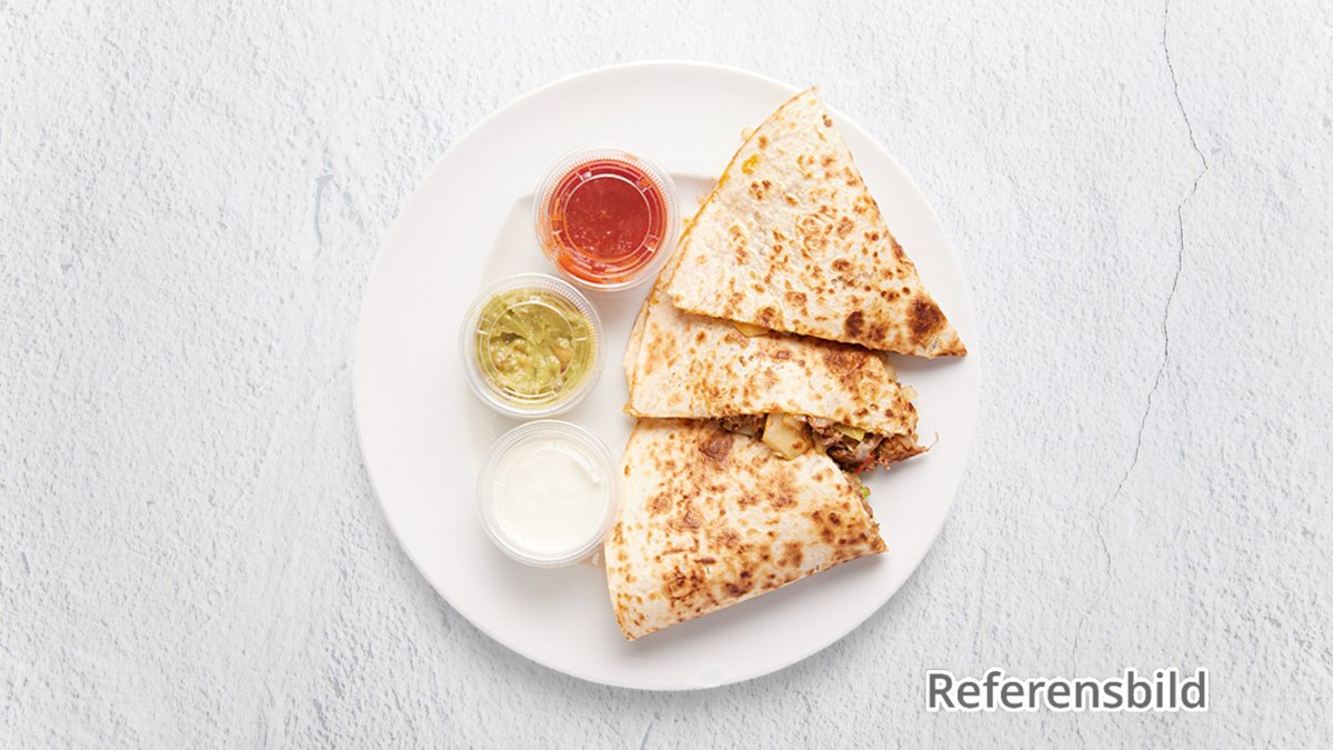 Hemgjord tortilla med tre sorters ost, serverad med picklad spetskål och ditt val av salsa. Välj salsa (styrka) i nästa steg.