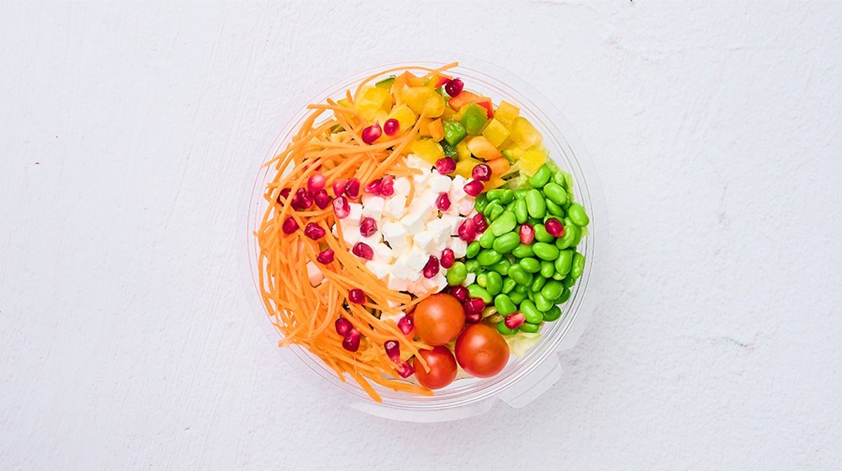 5 st valfria grönsaker, valfri dressing och ost.