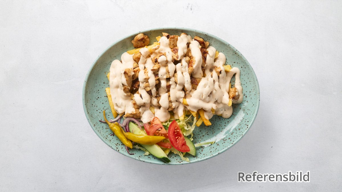 Nötkött, lök, kebabsås mild, tomater, isbergssallad, gurka och feferoni. Serveras med pommes