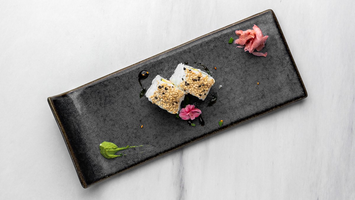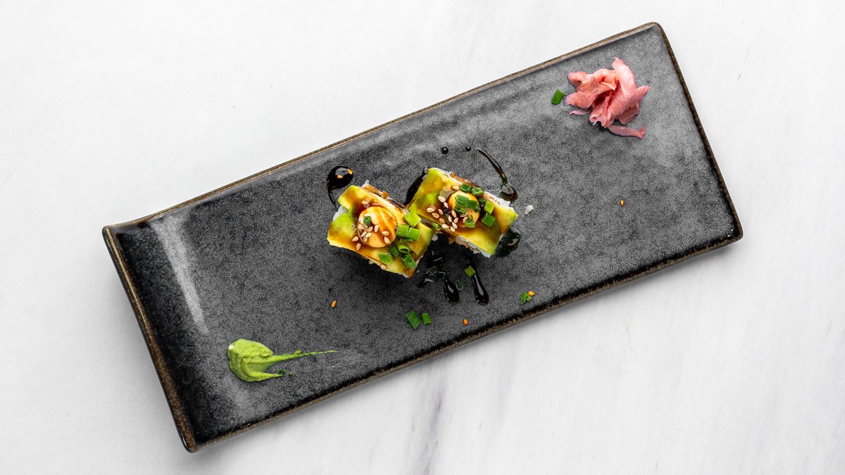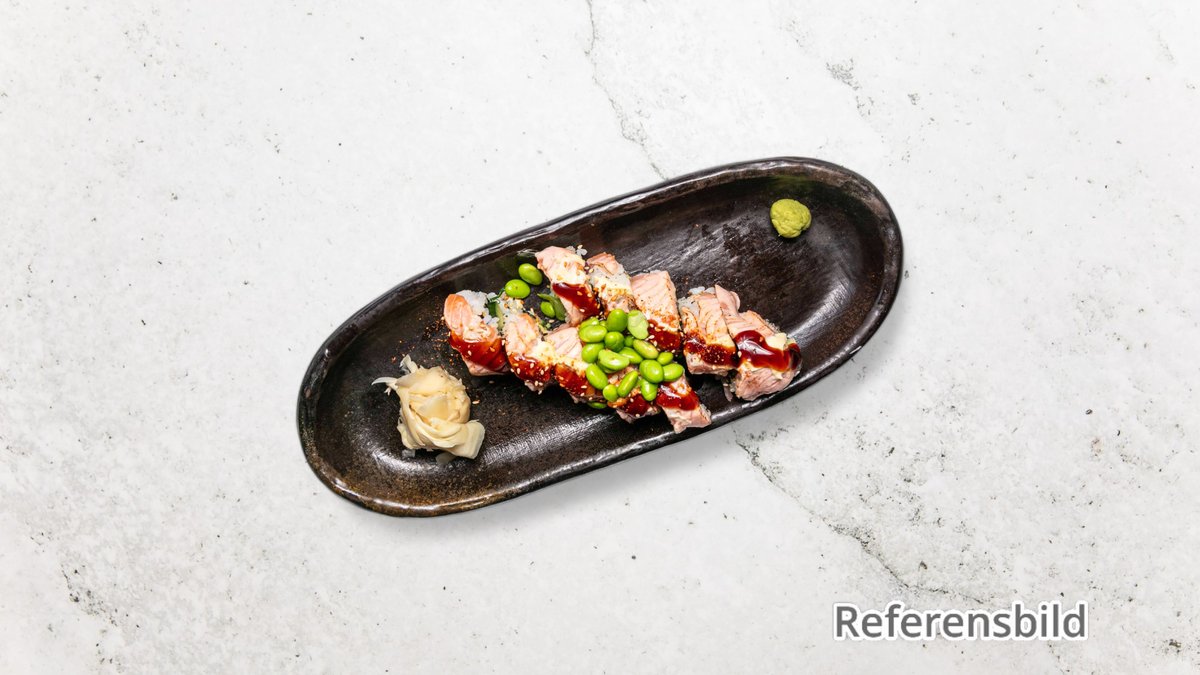 Friterad räka, avokado, gurka topping: flamberad lax, teriyakisås, chilimayo och sesam.