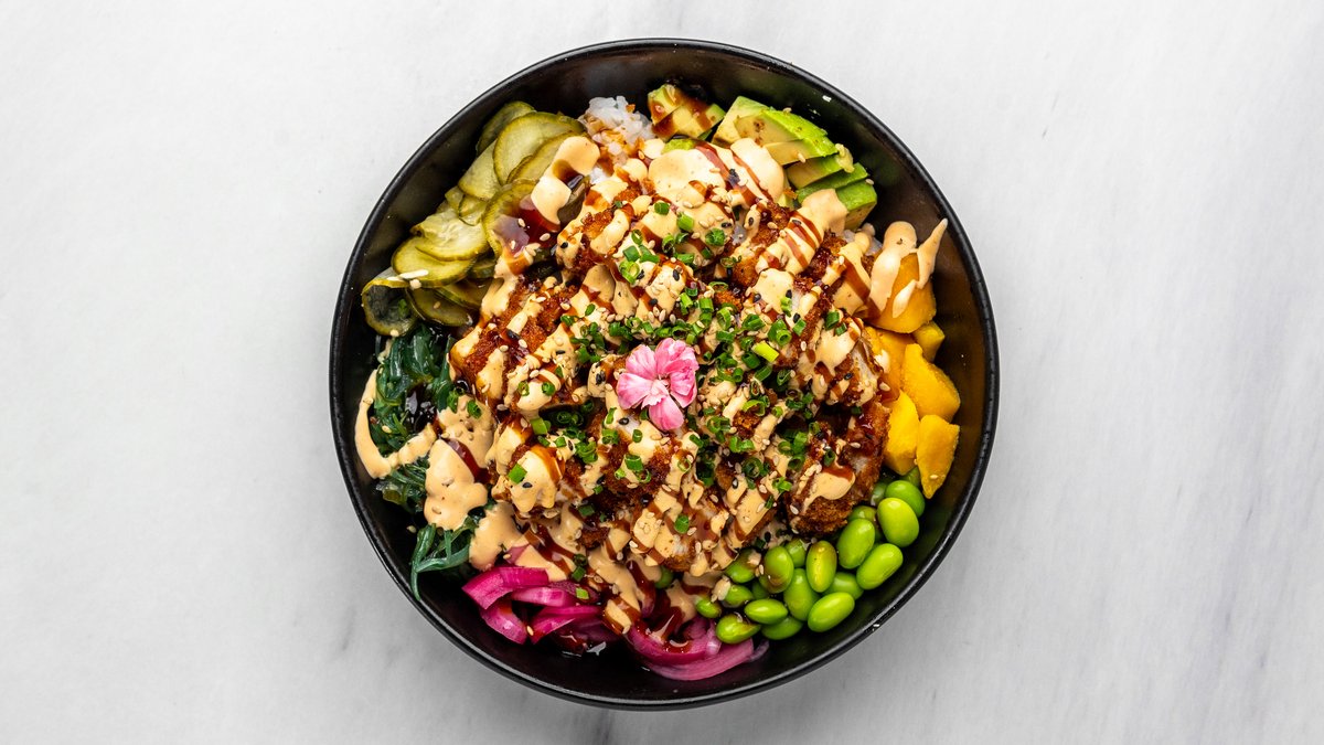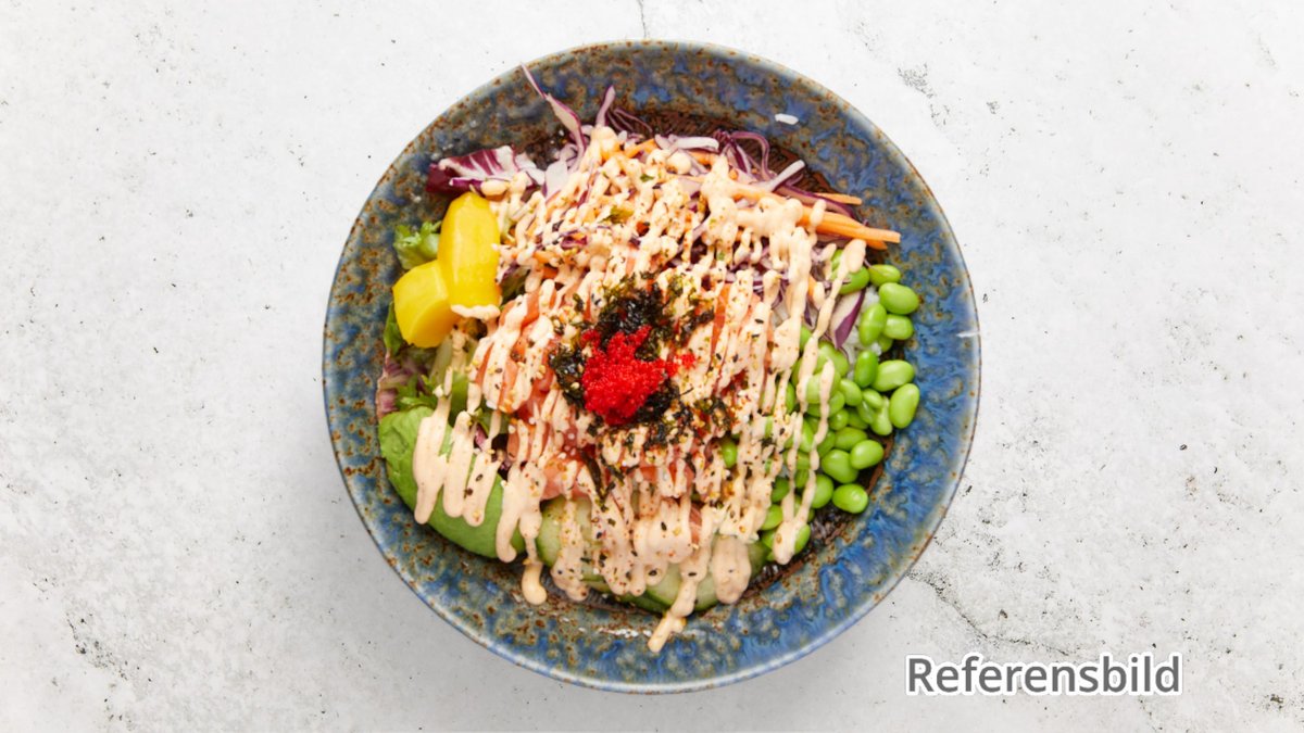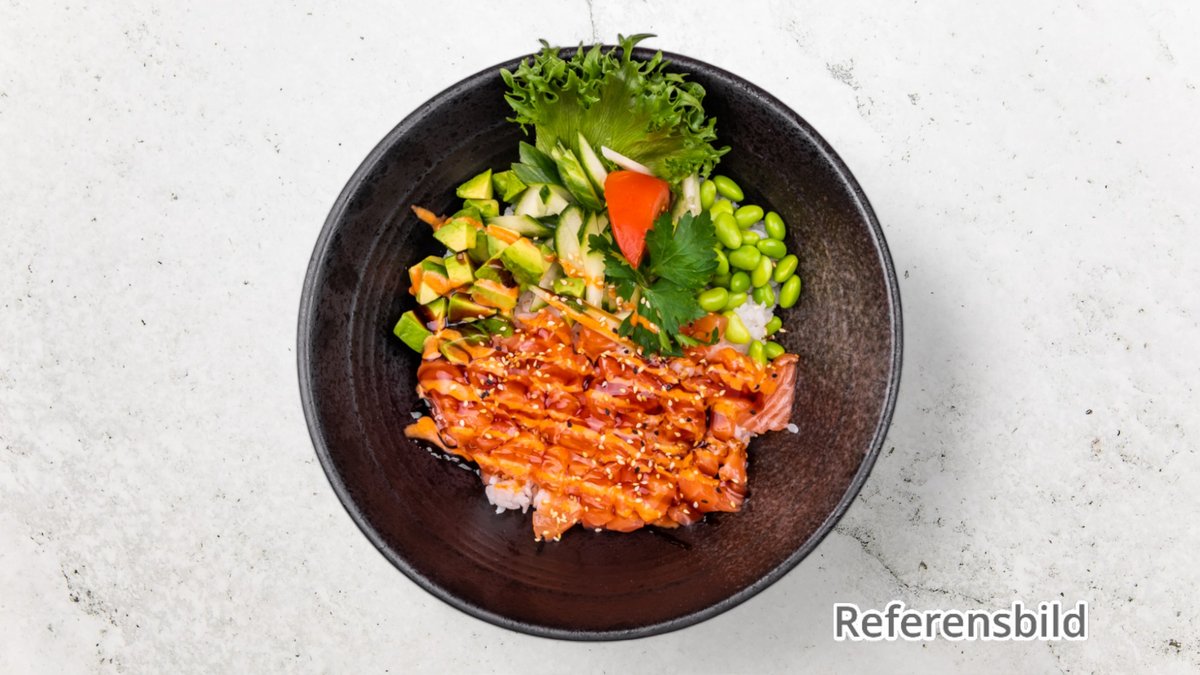 I alla bowls ingår: ris, edamamebönor, wakame sallad, mango, sesam, picklad rödlök, chilimayo, teriyaki, gurka, vårlök & avokado