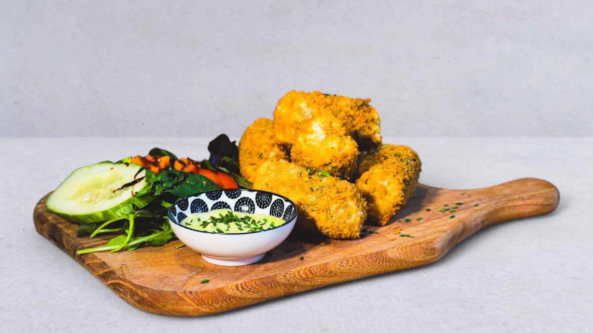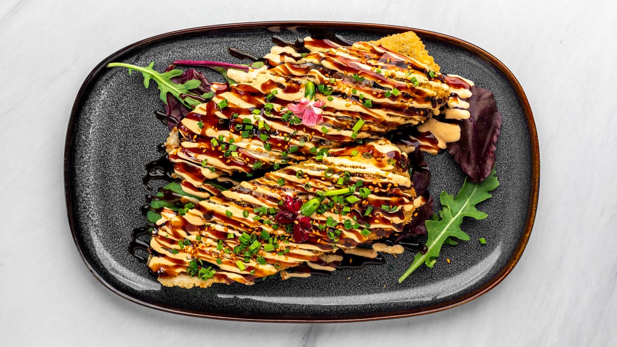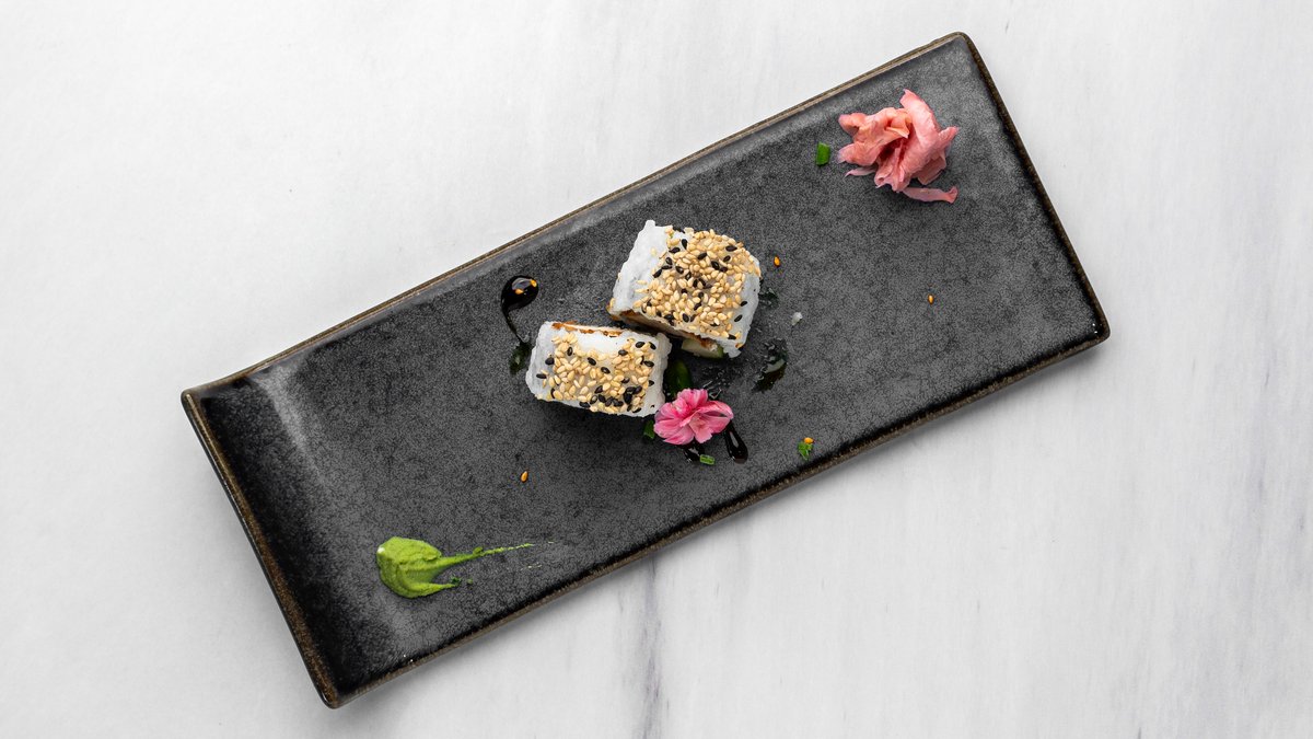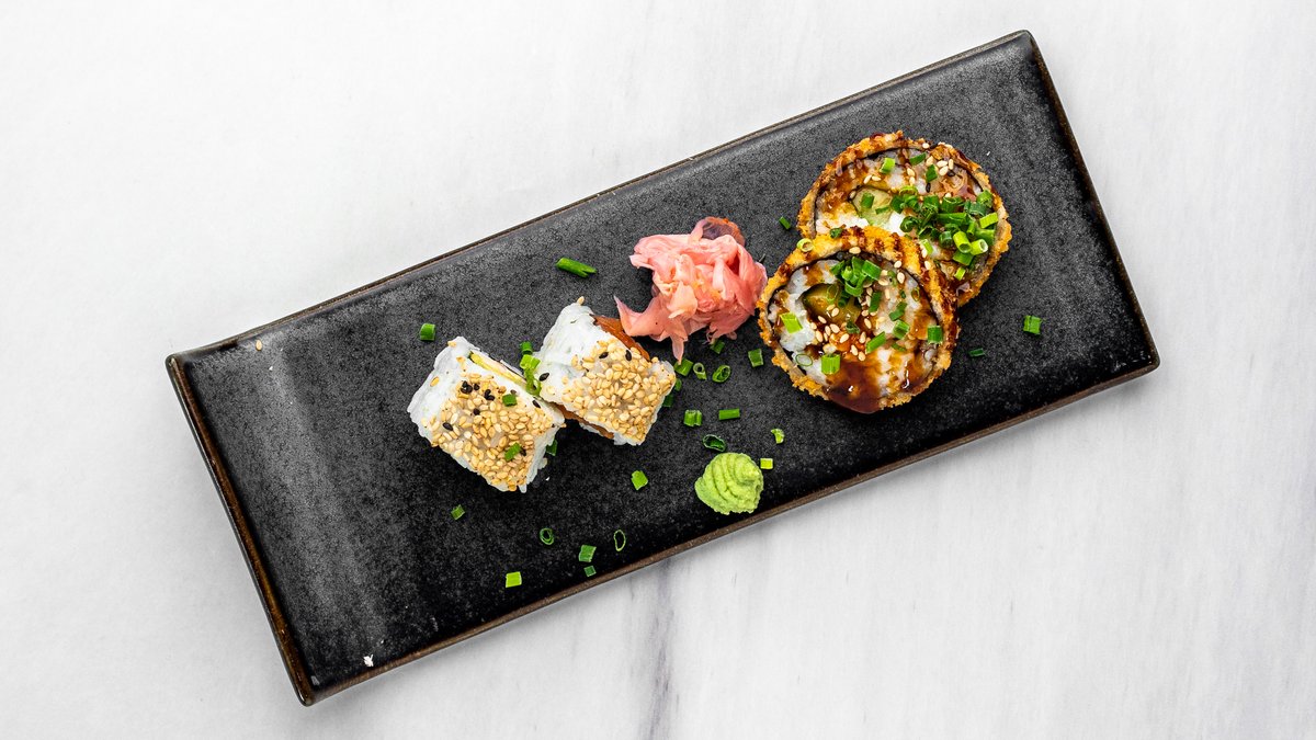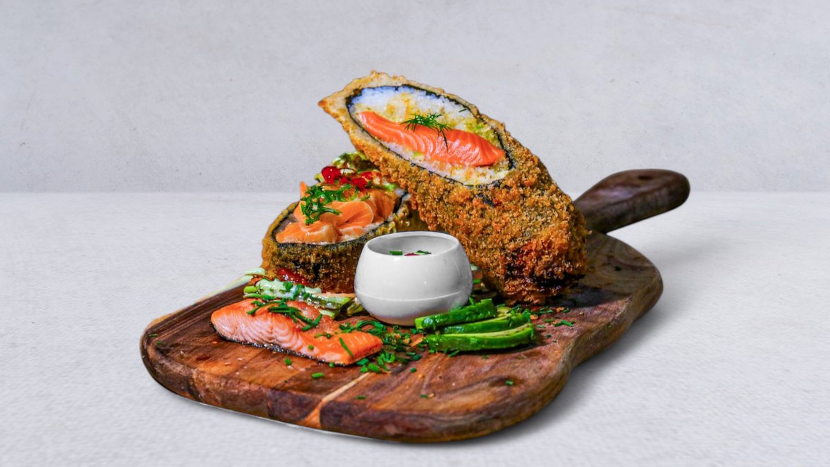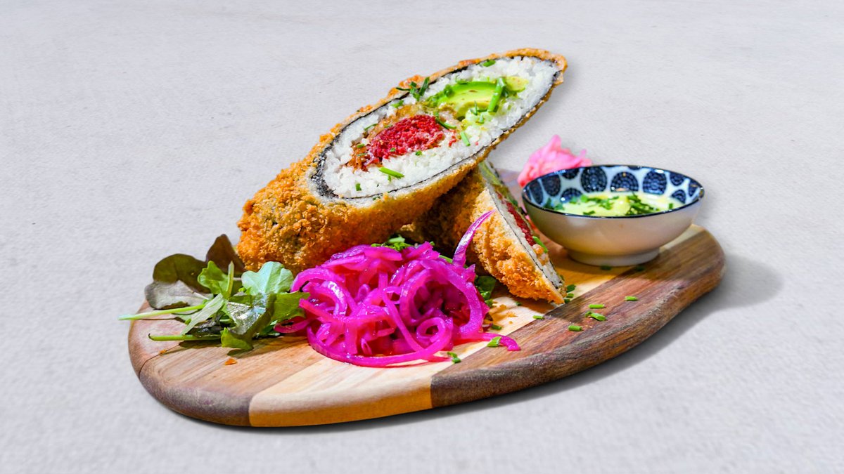 Tofu, ris, gurka, färskost, japansk majonnäs, picklad rödlök, sriracha och isbergssallad.