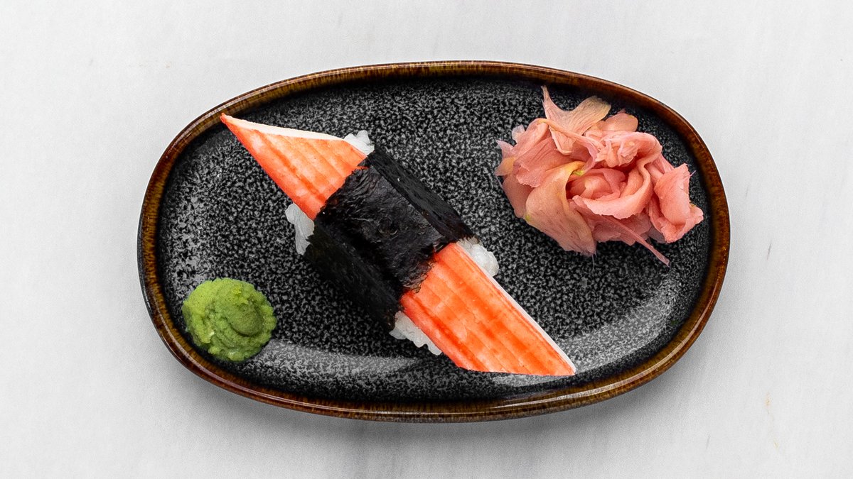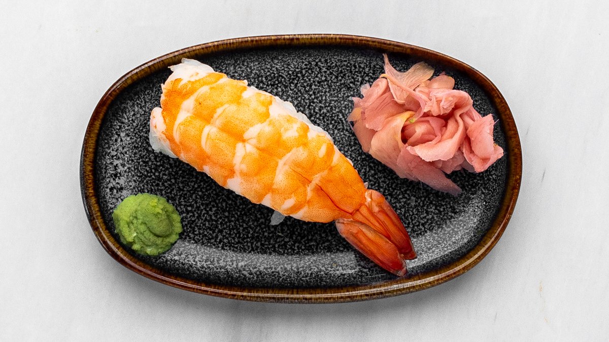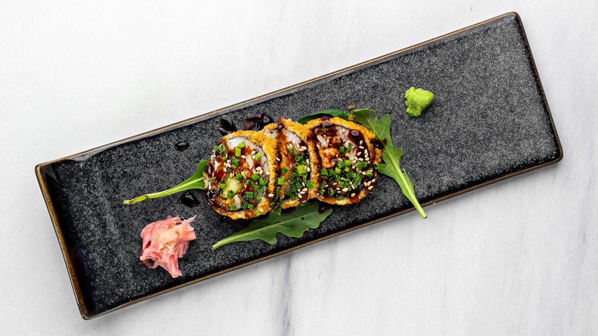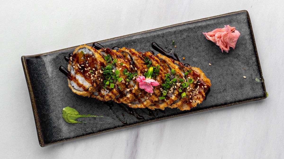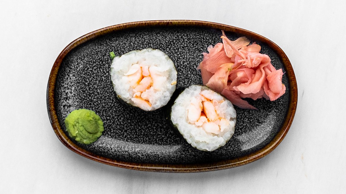 Friterad räka, ris, gurka, cream cheese, japansk majonnäs, picklad rödlök, sriracha och isbergssallad.