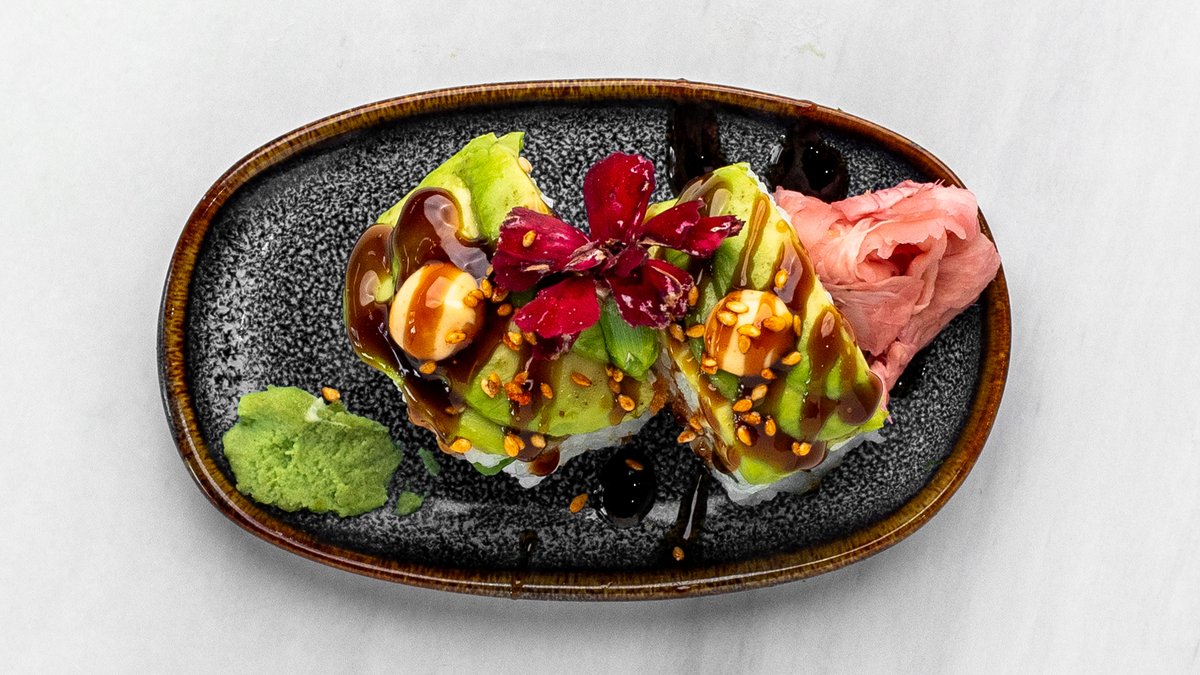 Avokado, ris, gurka, färskost, japansk majonnäs, picklad rödlök sriracha och isbergssallad.
