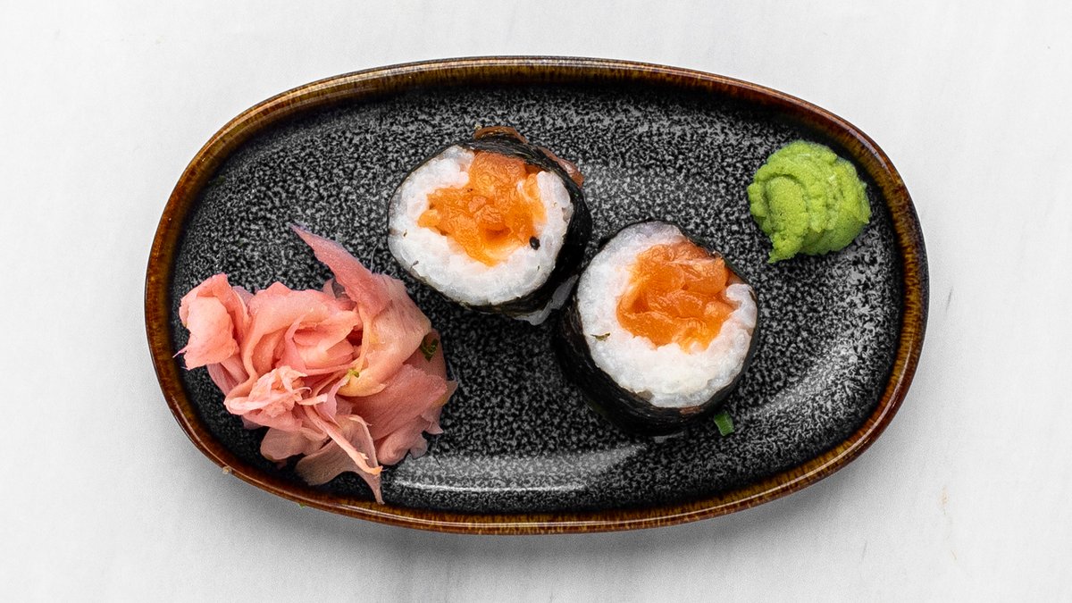 Lax, ris, gurka, cream cheese, japansk majonnäs, picklad rödlök, sriracha och isbergssallad.