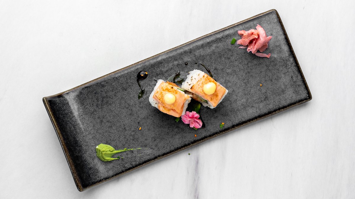 Lax, avokado, gurka topping: flamberad lax, japansk mayo, chilipeppar och siracha sås.