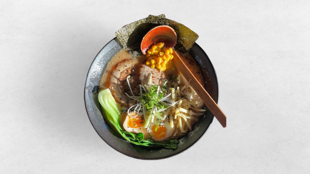 Kycklingbuljong med fläsk chashu, stekt bambuskott, marinerat ägg, böngroddar och majs. Toppas med pak choi, sjögräsblad, purjolök och sesamfrön.
