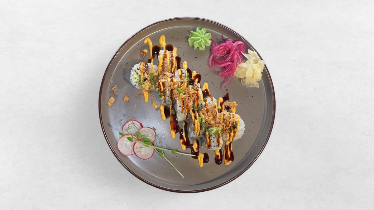 Tempuraräkor, gurka och avokado, toppad med säsongens mix