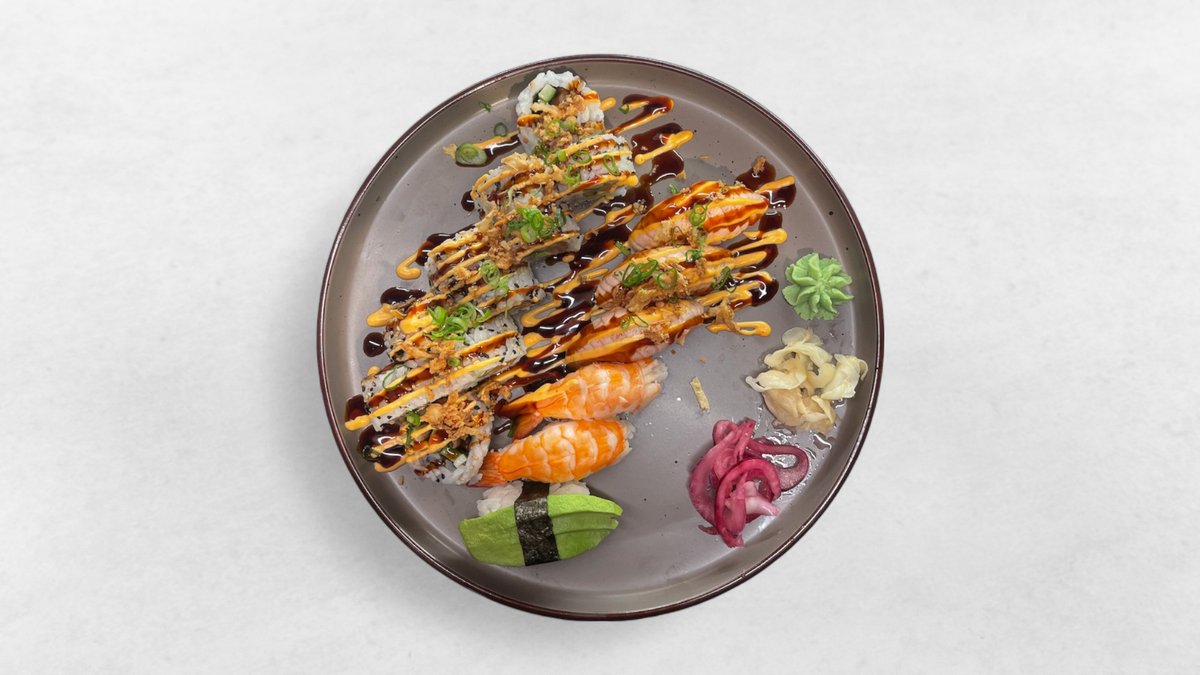 10 st ebi roll, 10 st salmon roll, 10 st lax, 5 st flamberad lax, 5 st tonfisk, 5 st räkor och 5 st avokado varav några bitar toppade med säsongens mix.