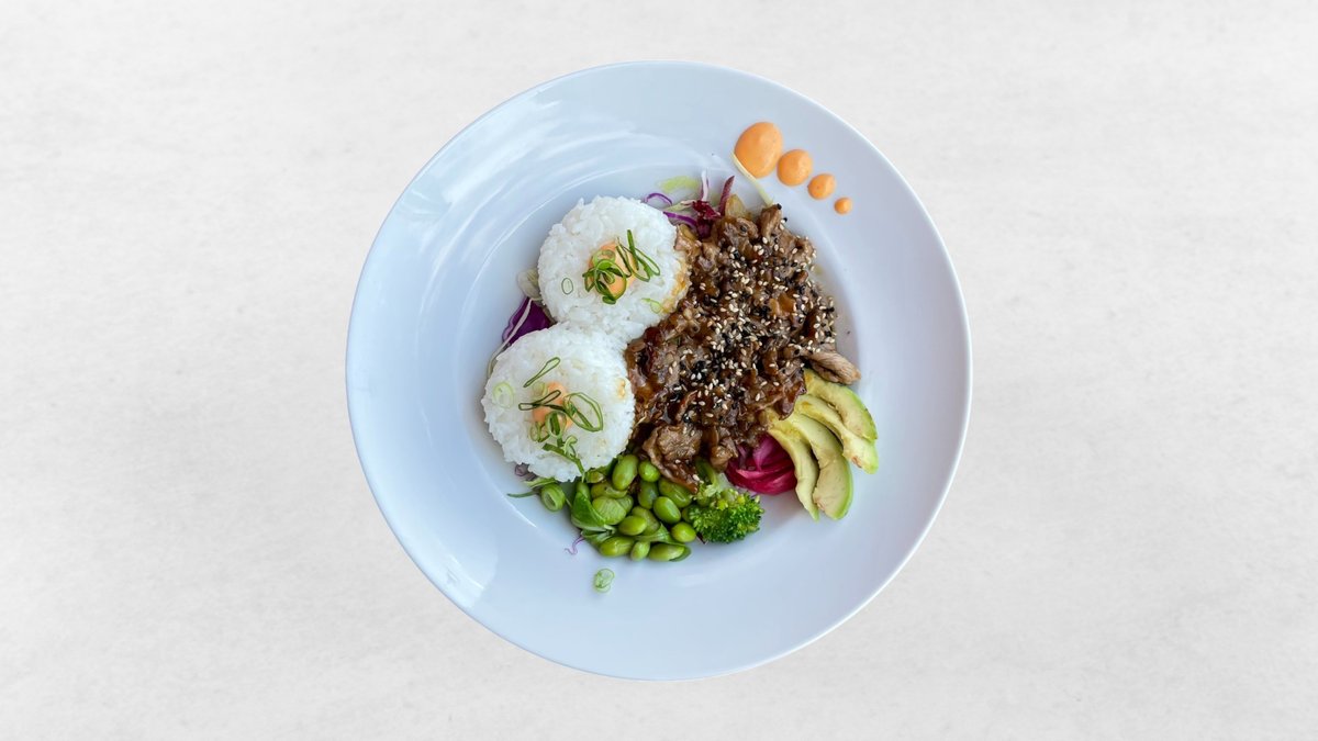 Strimlad entrecôte med sushiris, edamame, avokado och mixad sallad. Toppas med gurka, picklad rödlök, sesamfrön, chilimajonnäs och yakinikusås.