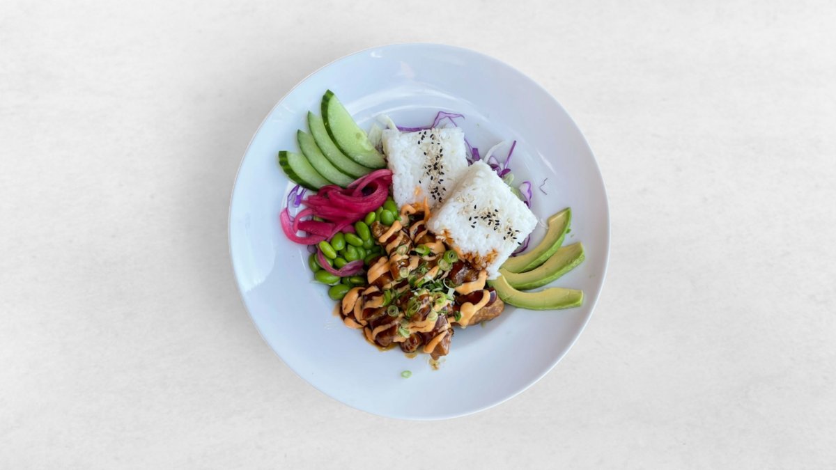 Marinerad kyckling serverad med sushiris, edamame, avokado och mixad sallad. Toppad med gurka, picklad rödlök, sesamfrön, chilimajonnäs och teriyakisås.