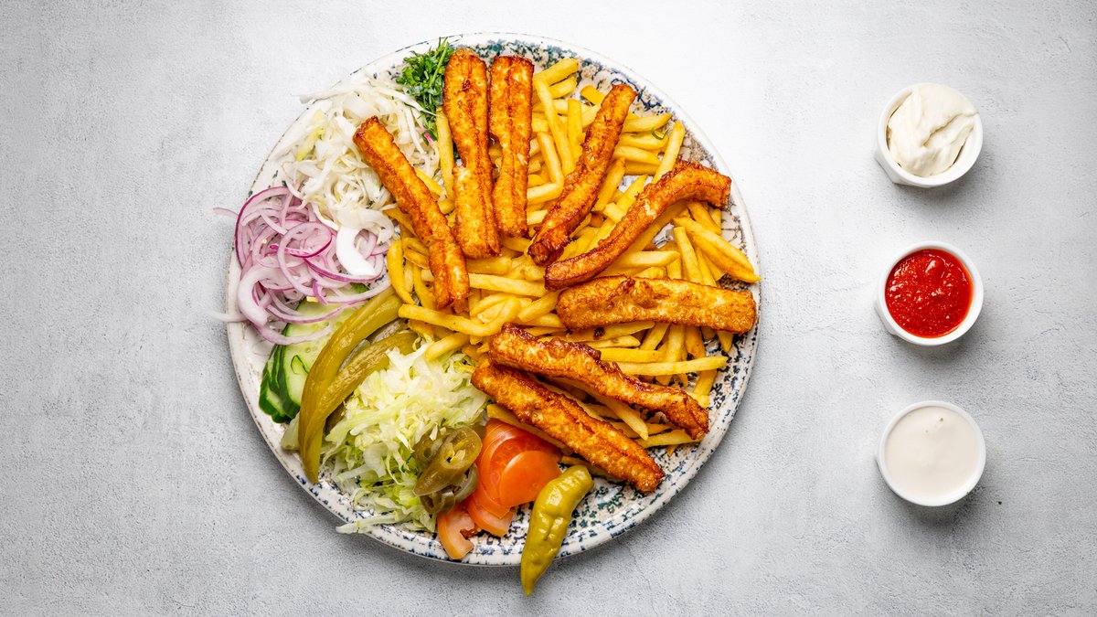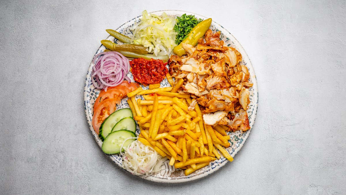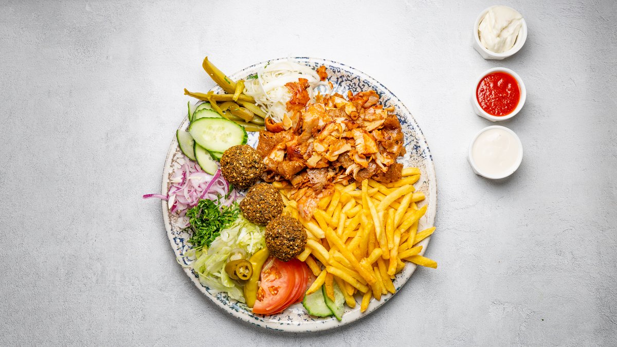 Välj mellan kebab, kyckling eller falafel.