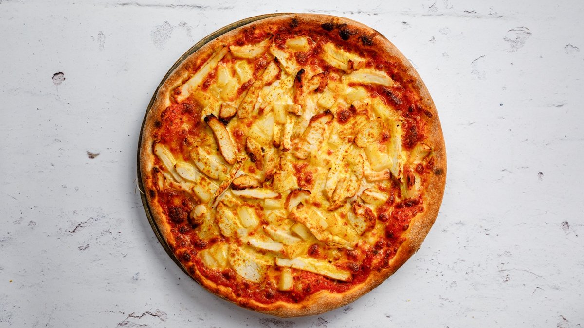 Tomatsås, ost, kyckling, färska champinjoner, färska tomater, lök, curry och stark sås.