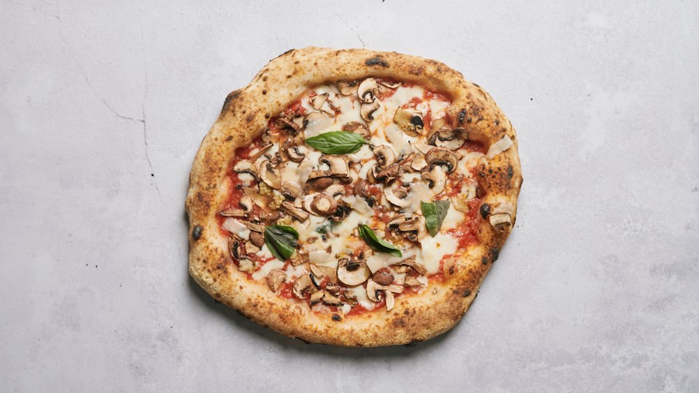 San marzano tomat, fior di latte, skogschampinjoner, vitlök, parmesan och evoo.