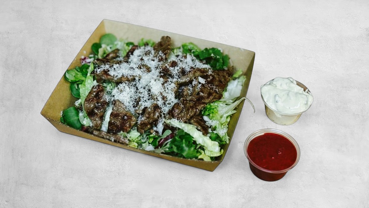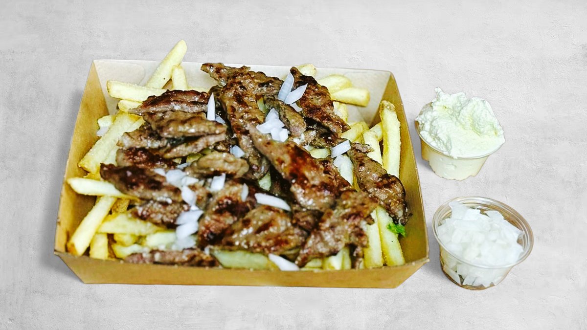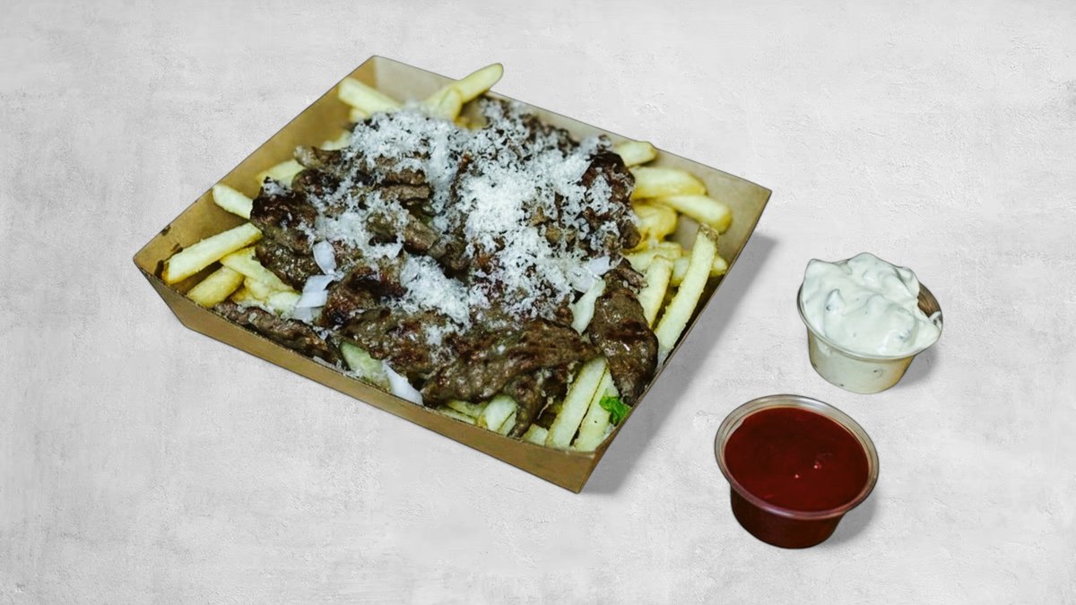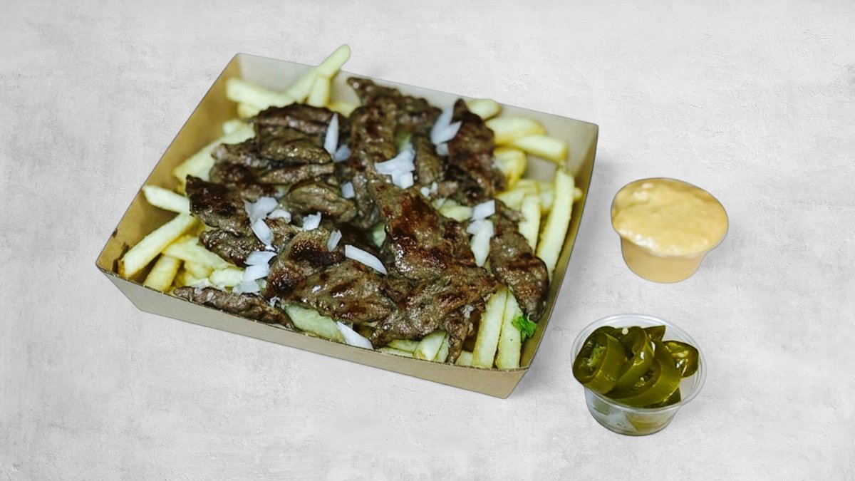 Pommes, smashade cevapi, sweet flame sås, sallad, picklade jalapenos