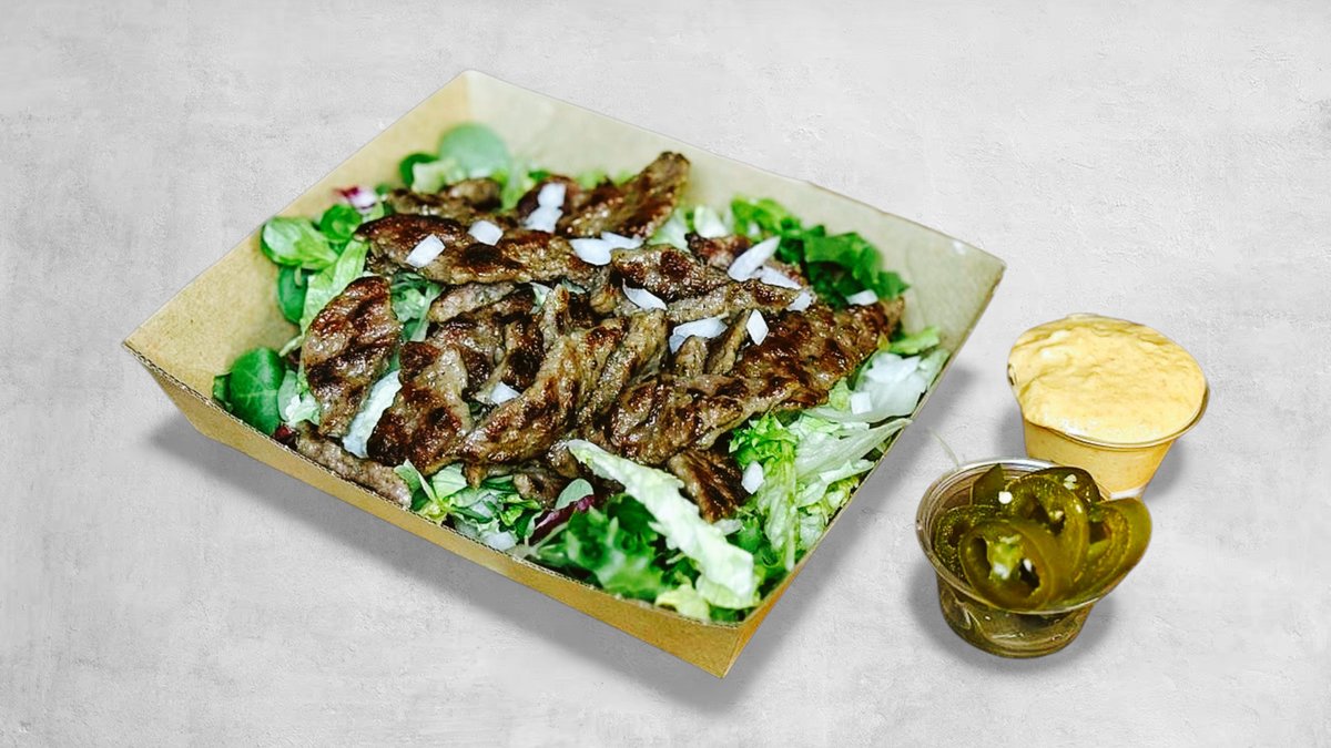 Blandad sallad, smashade cevapi, sweet flame sås, picklade jalapenos