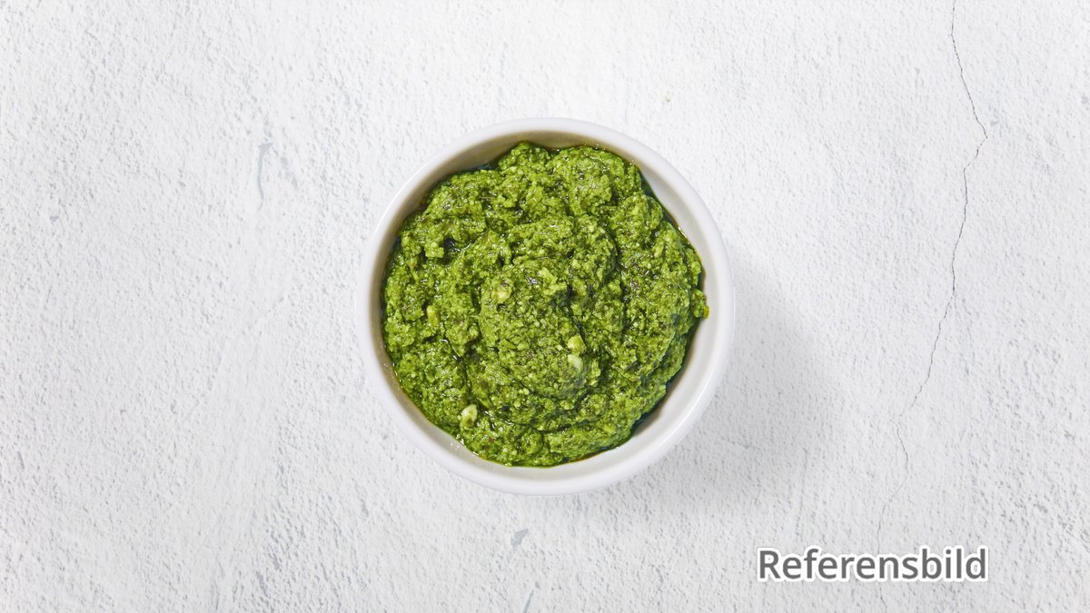 Tomatsås, parmaskinka, lök, mozzarellaost, pesto och soltorkade tomater.